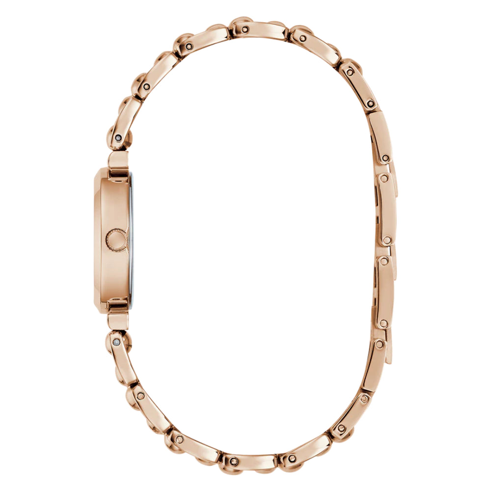 This compact 26mm silhouette spotlights a rose gold sunray dial accented with crystal hour markers and a radiant crystal ring that beautifully catches the light. A polished rose gold tone stainless steel case and matching bracelet, with self-adjustable G-links, deliver a rich, mirror-bright finish that is elevated, modern and photo-ready. Scaled down for a neat, tailored fit, the profile stays sleek and refined so the shine does the talking.
