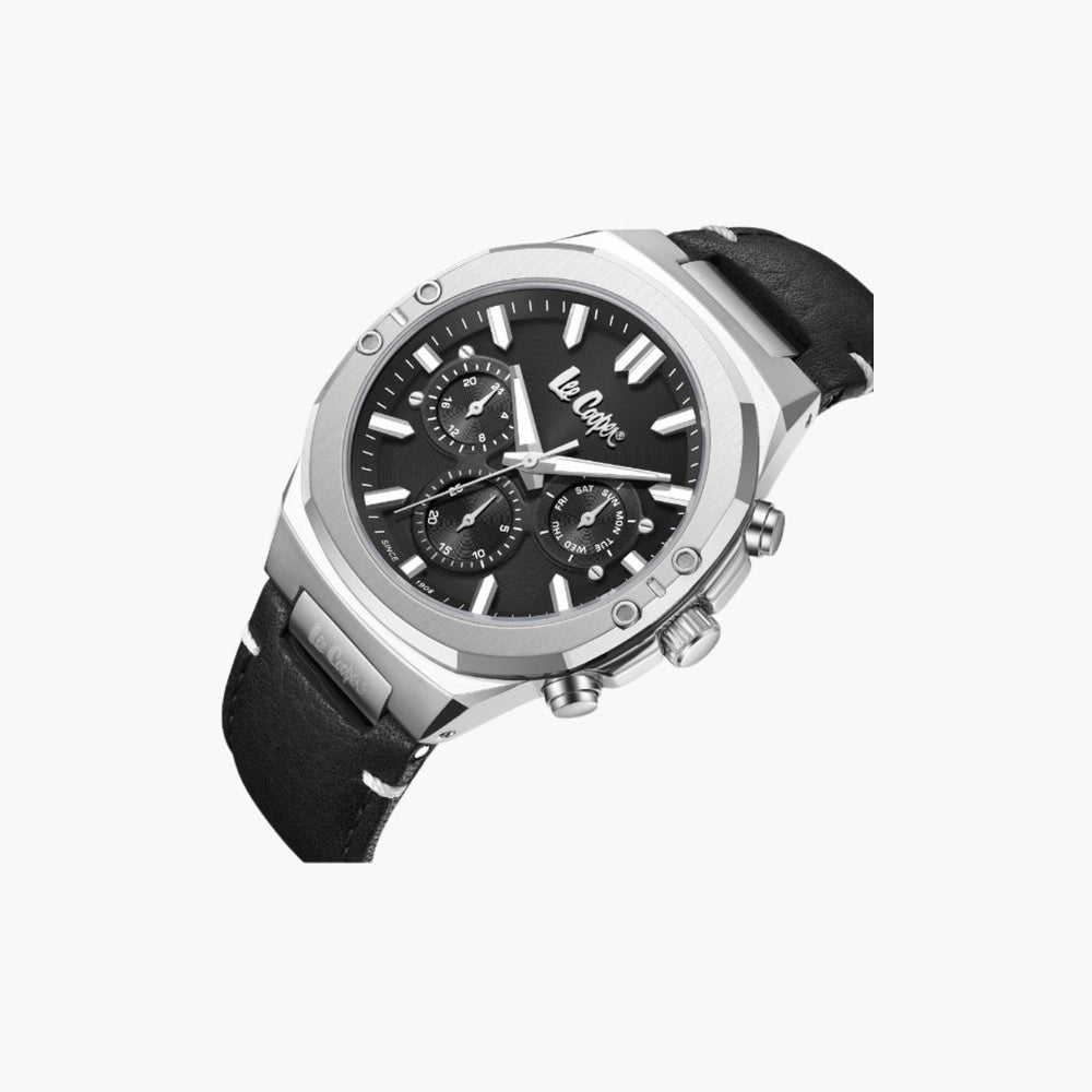 The image features a modern men’s wristwatch from Lee Cooper with a bold and sophisticated design. The watch has a silver-toned stainless-steel case paired with a black leather strap that includes visible white stitching along the edges, giving it a refined yet rugged appearance.