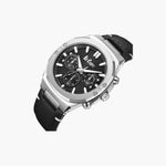 Large luminous-style hour indices and thick hands enhance readability, while a smooth metallic bezel surrounds the dial for a clean and contemporary look. On the right side of the case, there are three control elements: a central crown for adjusting the time and two push buttons used to operate the chronograph features.
