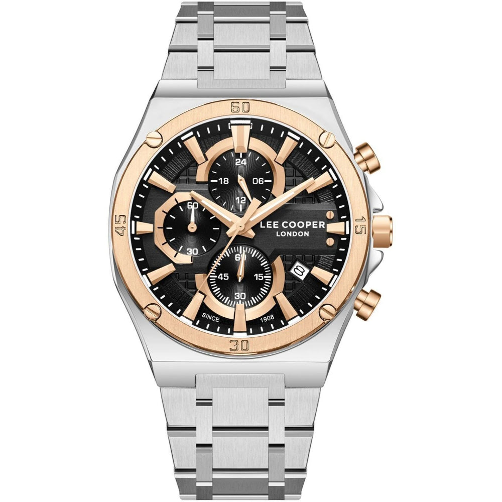 Experience timeless sophistication with the Lee Cooper Chronograph Silver Stainless Steel Strap Men's Watch LC08171.360. This 42mm timepiece combines a rose gold stainless steel case with a sleek silver metal strap for a refined aesthetic. Featuring a mineral glass face, quartz movement, and practical chronograph functionality with date display, it's built for everyday wear and special occasions alike. Water-resistant to 3 ATM and backed by a 2-year warranty, this watch delivers reliable performance in a lightweight 120g design.