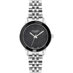 A women's quartz watch with a supermetal case. Black dial with translucent hour markers. Contrast silver hands. Tempered mineral crystal. Case diameter: 30 m. Water resistance: 30 m. A classic stainless steel bracelet, resistant to scratches and abrasions. An accessory for women who appreciate minimalist style and original design.
