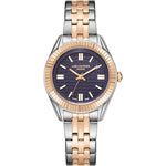 This women's watch features a supermetal case with a rose-colored finish and a fluted bezel. It features a quartz movement and a purple dial with a geometric relief pattern. Contrast applied hands and indexes. It features a scratch-resistant tempered mineral crystal. It also features an integrated steel bracelet with a partially rose-colored finish. This watch combines stylish design with originality.