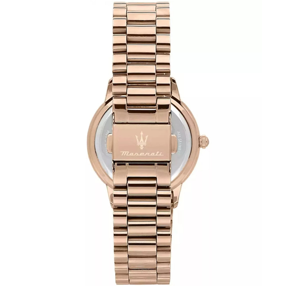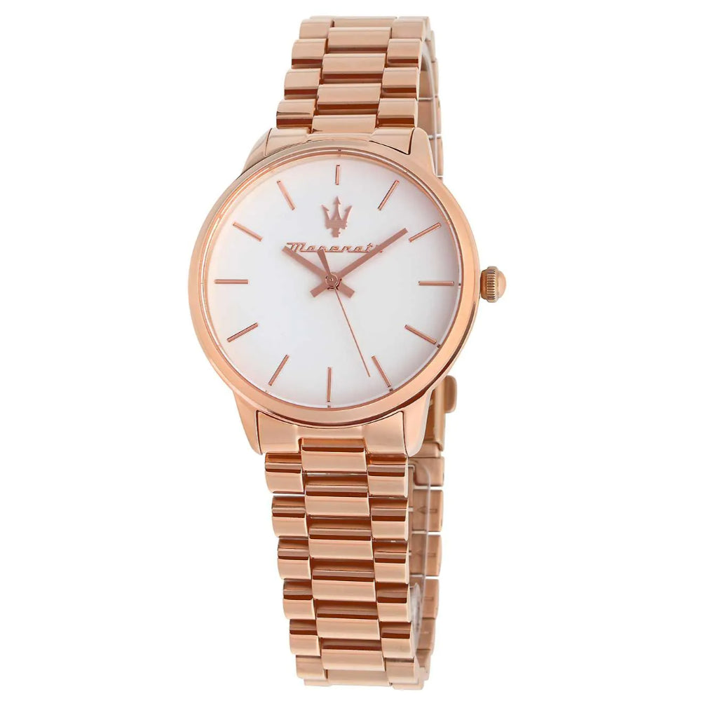 The Maserati Royale Lady Watch R8853147506 is an elegant accessory, ideal for formal events. The white dial is juxtaposed with a rose gold bracelet and an envelope in the same shade. The water resistance is 5 ATM.