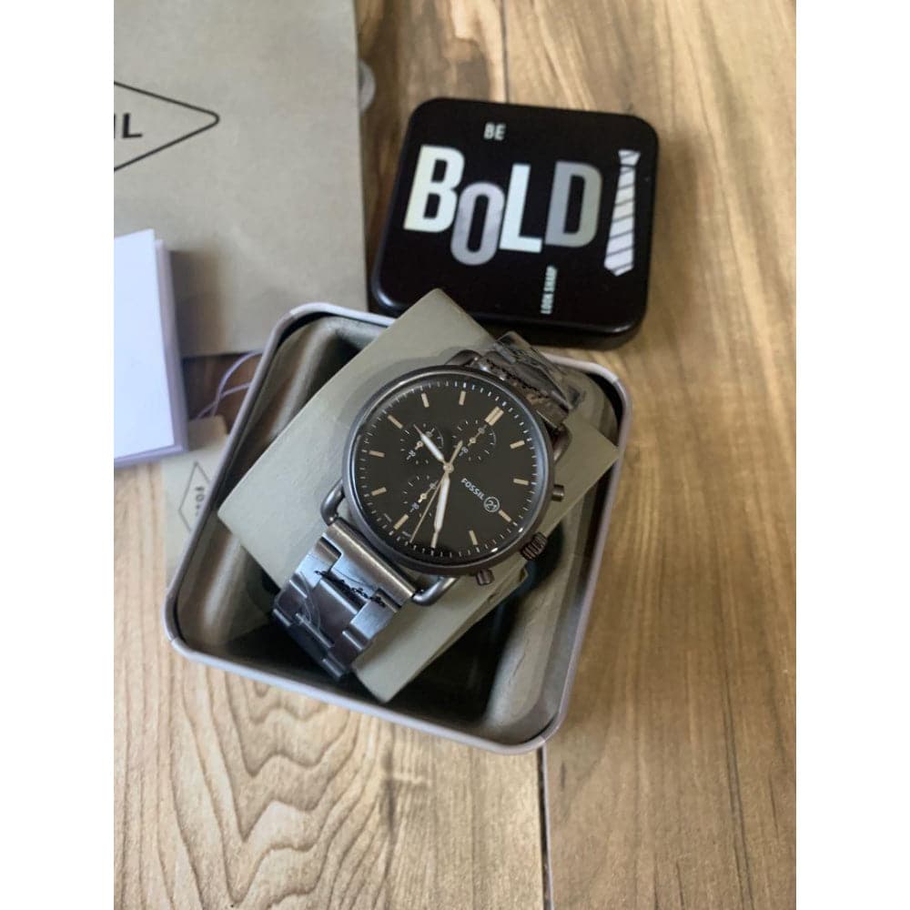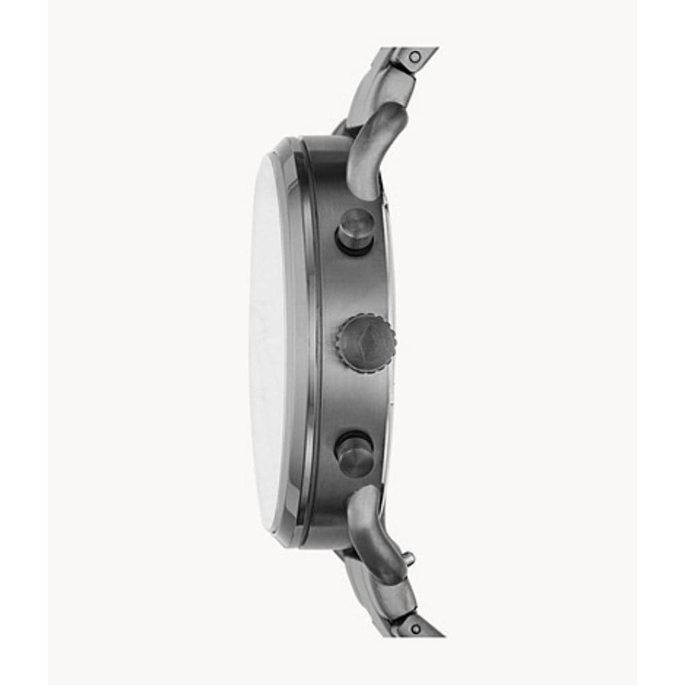 Black PVD stainless steel case with a olive leather strap. Fixed black PVD bezel. Black dial with luminous black hands and Arabic numeral hour markers. Minute markers around the outer rim. Dial Type: Analog. Luminescent hands. Three multi-function displays: 24 hour, date and day of the week. Quartz movement. Scratch resistant mineral crystal. Pull / push crown. Solid case back. Case diameter: 44 mm. Case thickness: 12 mm. Round case shape. Band width: 22 mm. Tang clasp. Water resistant at 100 meters / 330 feet. Functions: date, day, hour, minute, second. Casual watch style. Fossil Aeroflite Multi-Function Black Dial Olive Leather Men's Watch.