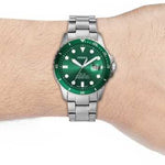Black PVD stainless steel case with a olive leather strap. Fixed black PVD bezel. Black dial with luminous black hands and Arabic numeral hour markers. Minute markers around the outer rim. Dial Type: Analog. Luminescent hands. Three multi-function displays: 24 hour, date and day of the week. Quartz movement. Scratch resistant mineral crystal. Pull / push crown. Solid case back. Case diameter: 44 mm. Case thickness: 12 mm. Round case shape. Band width: 22 mm. Tang clasp. Water resistant at 100 meters / 330 feet. Functions: date, day, hour, minute, second. Casual watch style. Fossil Aeroflite Multi-Function Black Dial Olive Leather Men's Watch CH2941.