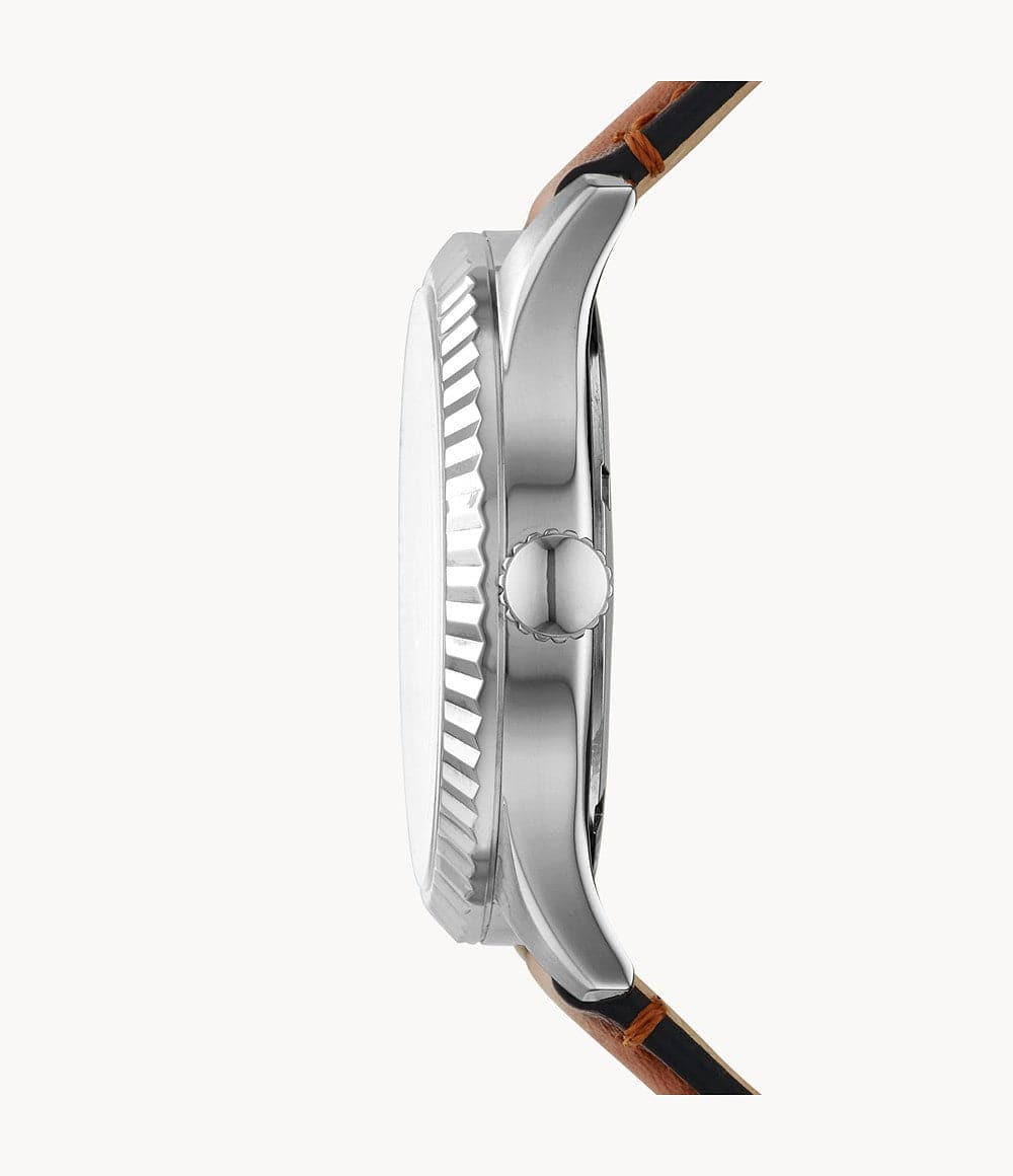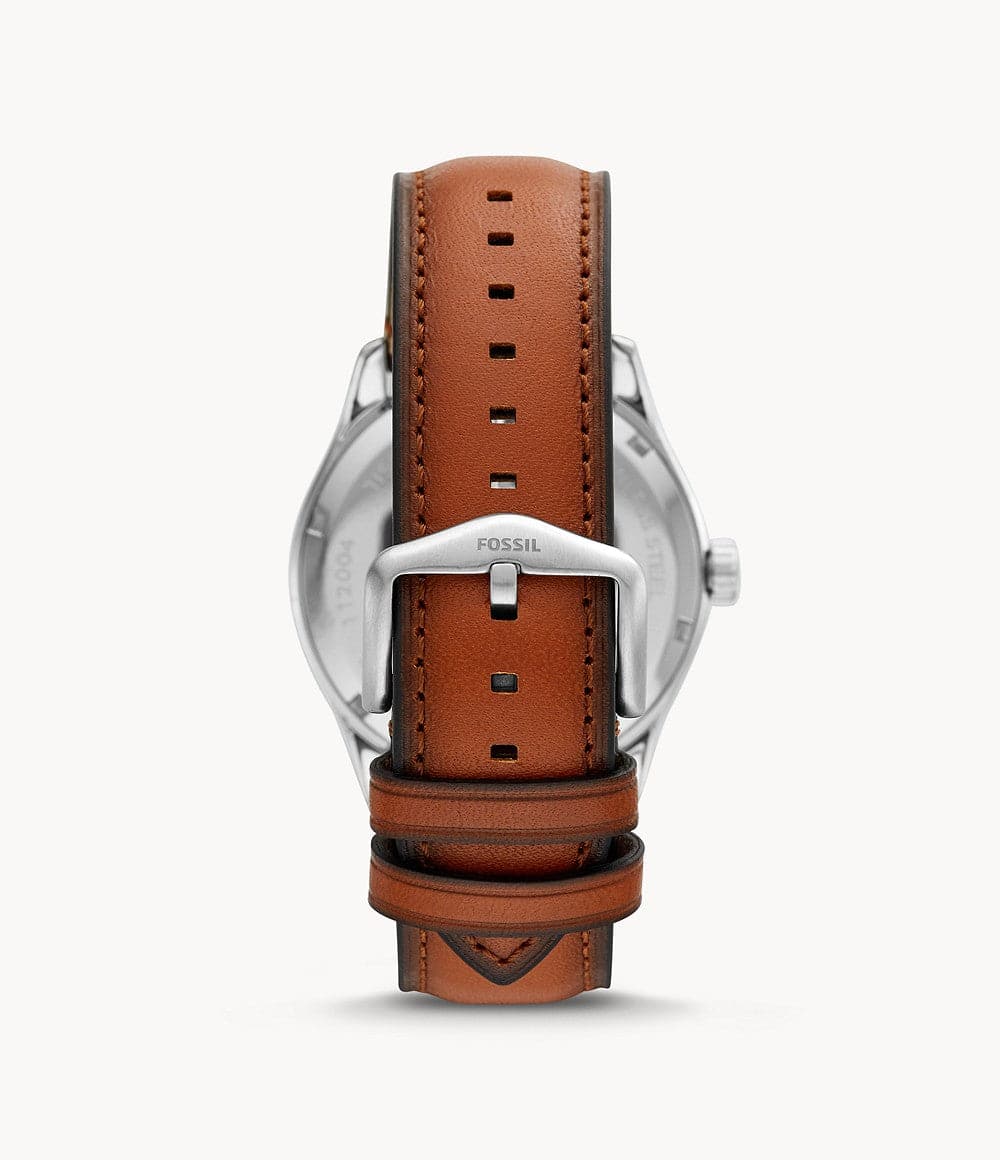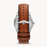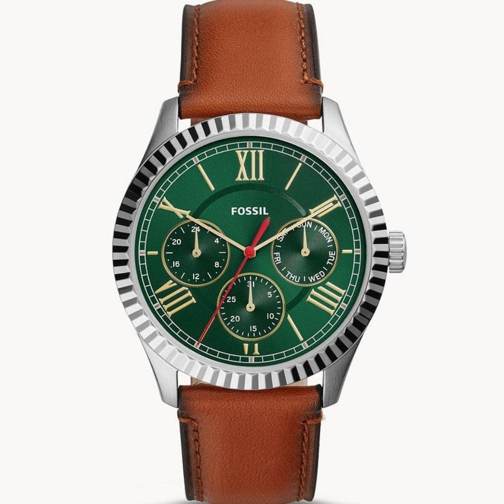 Give your wrist the perfect blend of style and comfort by wearing this men's analog watch from the Chapman collection by Fossil. Functional on a quartz movement and protected by a mineral glass, the green round dial is housed in a 44 mm case. It displays stick and Roman numeral hour markings and a crown for time adjustment. The genuine leather strap comes in a brown hue that further elevates the look of the watch.