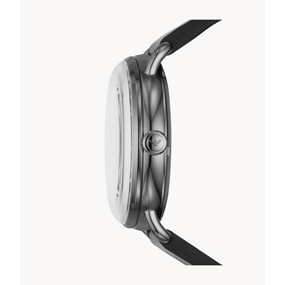The mineral crystal on this timeless Emporio Armani Aviator watch perfectly accentuates any outfit or style. This watch is capable of being water resistant up to 50 M so it will stay safe after a spill. This is a watch you can rely on to keep you on time and overcome whatever obstacles the day throws at you.  A black leather band with a practical clasp will keep this watch comfortably and firmly clasped to your hand. Add this Emporio Armani Aviator timepiece to complement any outfit or personal style.