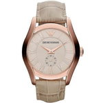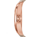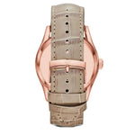 A nude leather strap complements the rose gold-tone stainless steel case with a grey sunray dial and Roman numeral indexes.