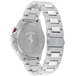 The Pilota Evo collection defines the perfect balance between sport and sophistication. The 44mm case features a refined construction that contours and chamfers in all the right places and is topped with a multi-faceted tachymeter, featuring the Scuderia Ferrari name, and crown protection for added sport. The distinctive case also features a remarkable gas-pedal inspired pusher design at 2 o’clock, accented in Scuderia Ferrari’s signature Rosso Corsa red. The dial is indented with horizontal lines that stretch across the surface, emphasizing the refined sport look and character of the timepiece. The timepiece is also offered on a linked bracelet for a refined look.