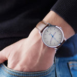 Silver-tone stainless steel case with a brown leather strap. Fixed silver-tone stainless steel bezel. Blue dial with luminous gold-tone hands and index hour markers. Minute markers around the outer rim. Dial Type: Analog. Quartz movement. Scratch resistant mineral crystal. Pull / push crown. Solid case back. Round case shape. Case size: 44 mm. Case hickness: 7 mm. Band width: 21 mm. Tang clasp. Water resistant at 50 meters / 165 feet. Functions: hour, minute, second. Additional Info: in general, suitable for short periods of recreational swimming, but not diving or snorkeling. Dress watch style. Fossil Minimalist Blue Dial Brown Leather Mens Watch FS5304.