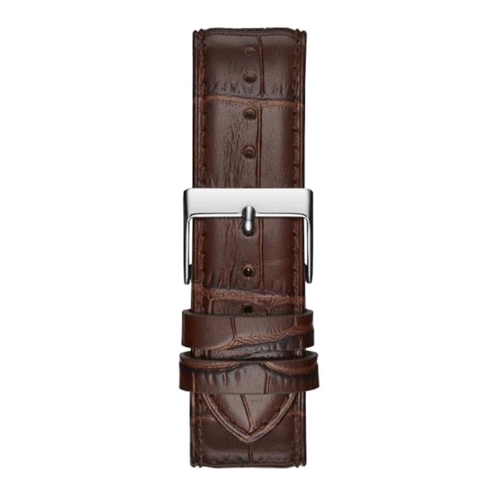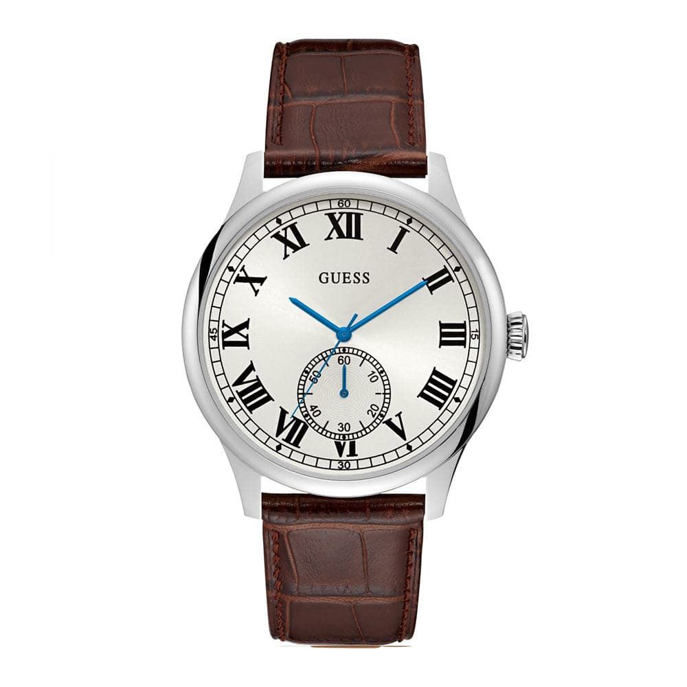 GUESS Gents watch featuring a polished silver case with sunray white dial and brown croc-effect leather strap.