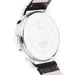 This dressed up timepiece has a black dial with roman numerals and a genuine leather strap.