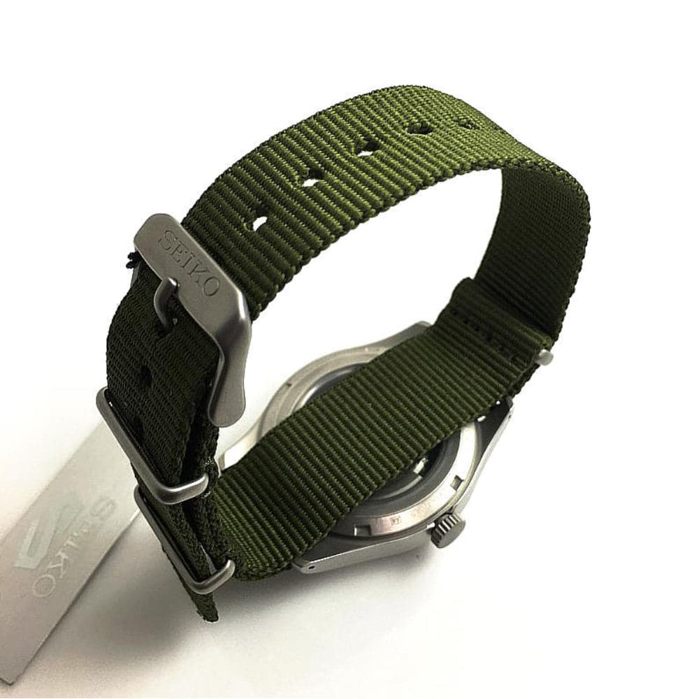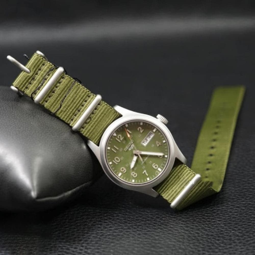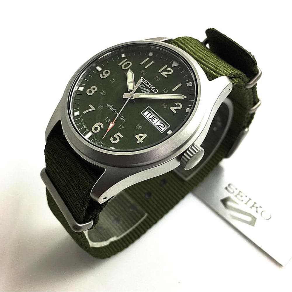 Seiko 5 Sports watch with 4R36 automatic movement, 41 hours charge reserve, 24 jewels, stainless steel case of 39,4 m/m diameter and 13.2 m/m thickness, 77 gr weight, green dial with Arabic numbers, day and date window at 3, silver indexes and hands with Lumibrite treatment, screw-down crown, screw-in case back, water resistant 10 BAR (100 meters), hardlex curvado crystal, green nylon strap.