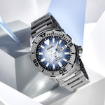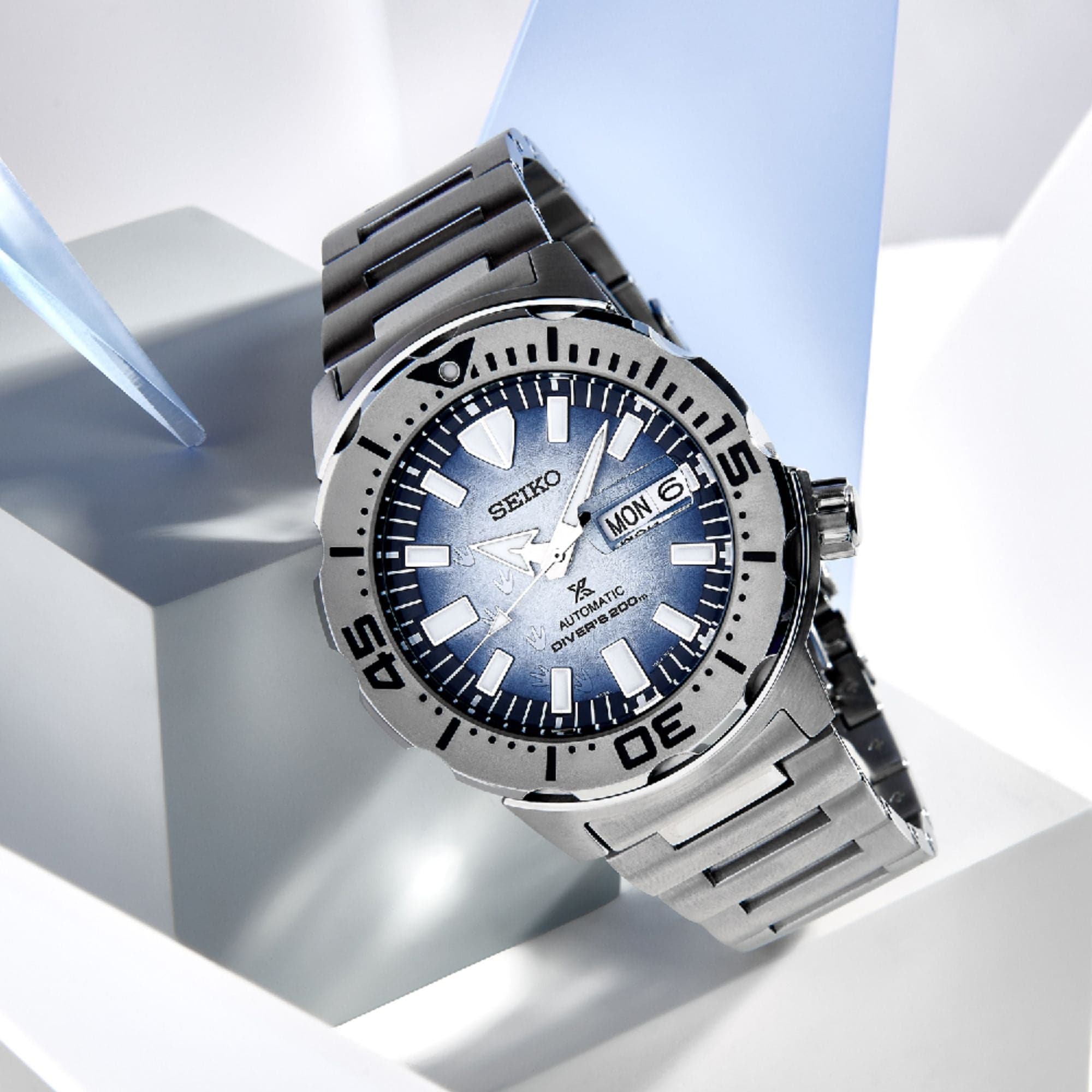 Seiko Prospex watch with 4R36 automatic movement, 41 hours charge reserve, 24 jewels, stainless steel case of 42.4 m/m diameter and 13.4 m/m thickness, 187gr weight, iced blue dial, day/date window at 3, indices and gray hands with Superluminova treatmentscrew-down crown, screw-in case back, water resistant 20 BAR (200 meters), hardlex crystal, stainless steel bracelet.