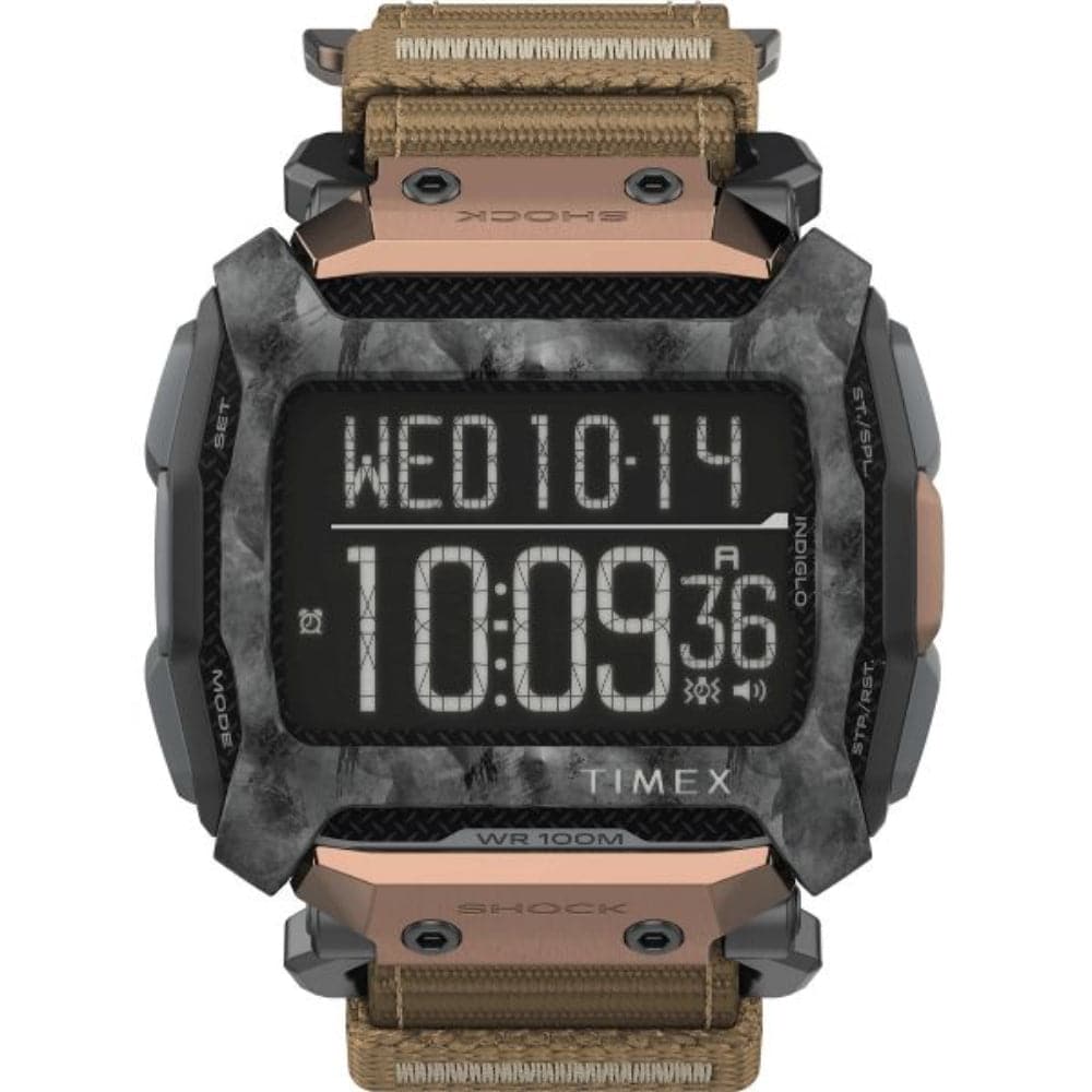 The Command shock watch is the proof of the brand's legendary durability. Featuring a black resin case and a brown fabric FAST WRAP strap, this watch is built to keep up with your lifestyle. It is shock-resistant, water-resistant up to 100 meters and features hydration alerts, Indiglo backlight with night-mode, stopwatch with lap and split times, countdown timer, dual-mode alarm, 24-hour countdown timer with stop and repeat three daily, weekday or weekend alarms with five-minute backup, three-time zone, alarm forward or backward setting, 24-hour time month, day and date display.