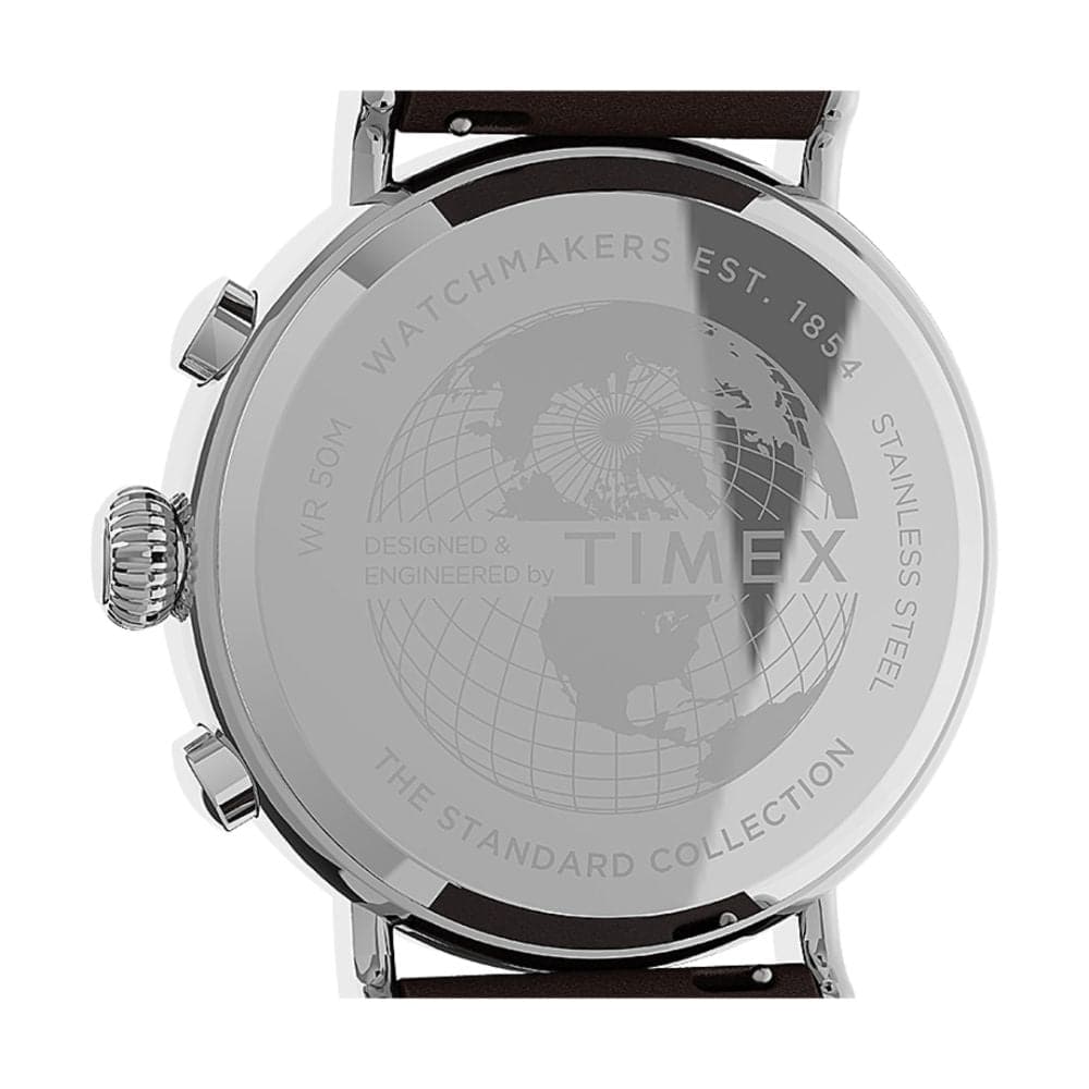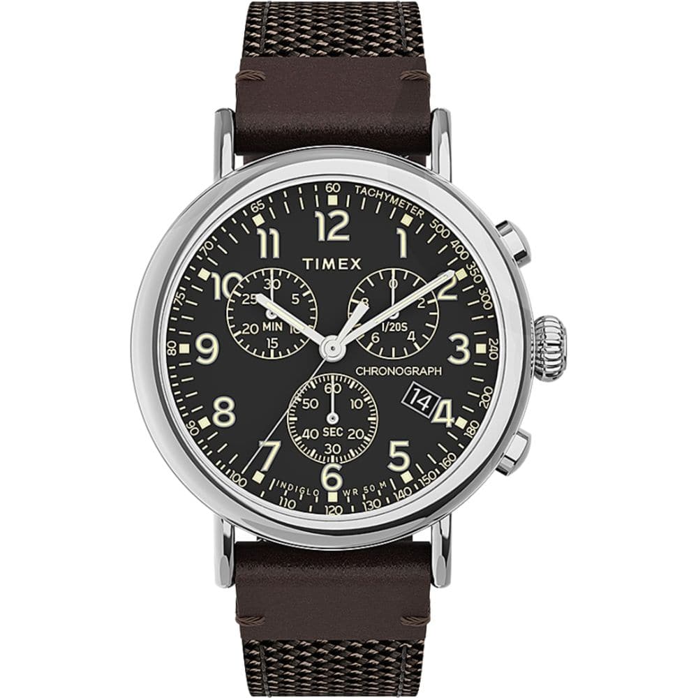 A casual way to wear a classic watch, the careful attention to detail present in our Timex Standard collection allows the watches to shine as some of our most refined everyday timepieces. Designed with versatility in mind, this chronograph watch brings together classic elements with modern materials and easily-interchangeable straps. The brown hybrid strap in leather and woven fabric complements the all-metal case, black dial and traditional oversized crown, a nod to our original wrist watch.