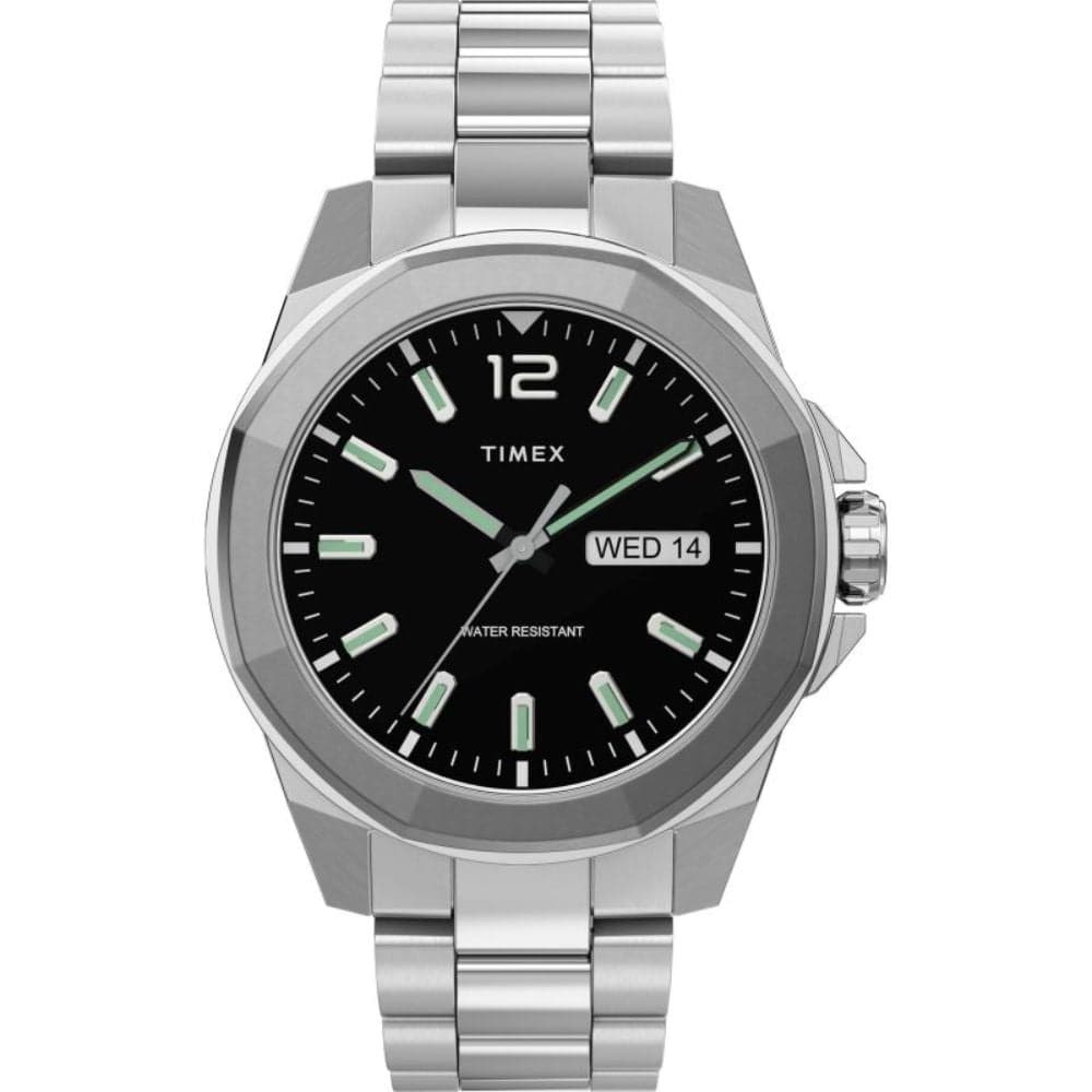The chunky octagonal stainless-steel case provides a strong look for the Gents Timex Metropolitan Watch, which has a black dial featuring luminous hour baton markers and hands, and subtle minute indicators. The chunky metal bracelet is a stylish addition. This is a dependable designer watch that you can wear for work or for play.