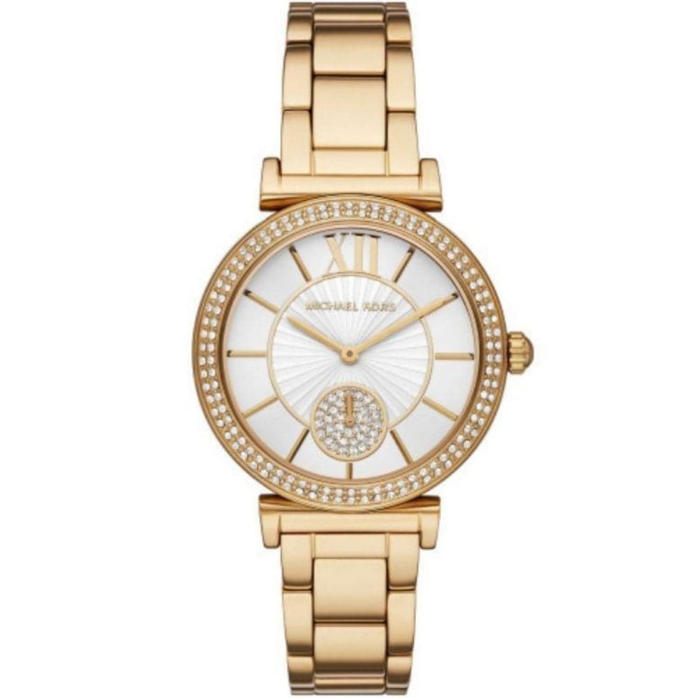 A Michael Kors chronograph watch in silver-tone stainless steel has a polished look and a striking shine. Roman numerals and a date wheel accent the dial, which is outlined by a textured bezel. Hinged-snap clasp.