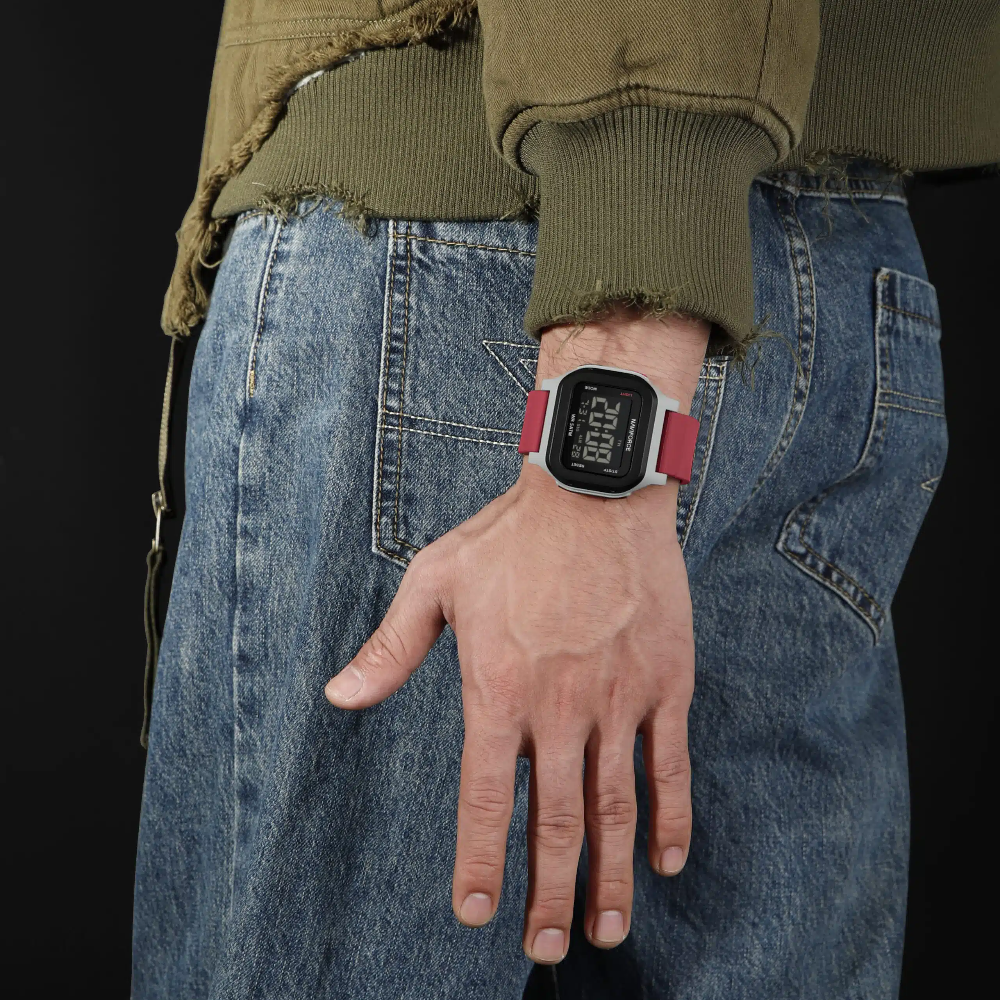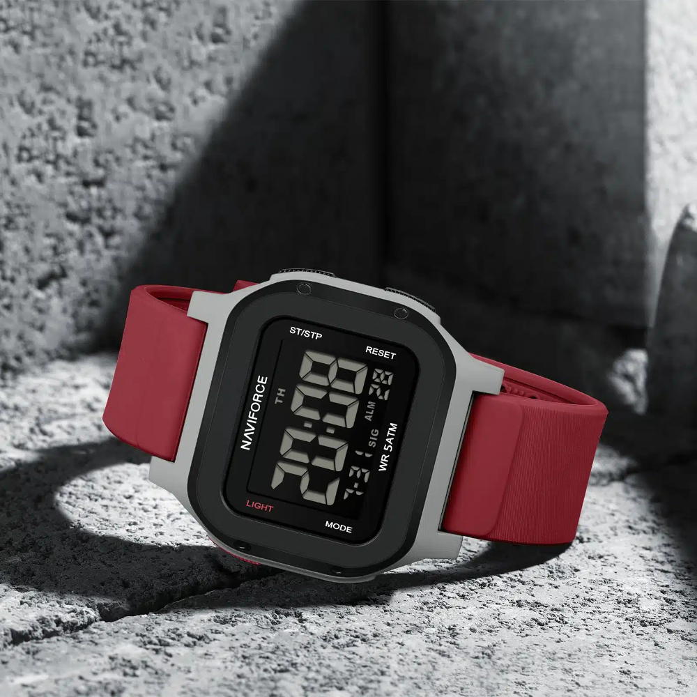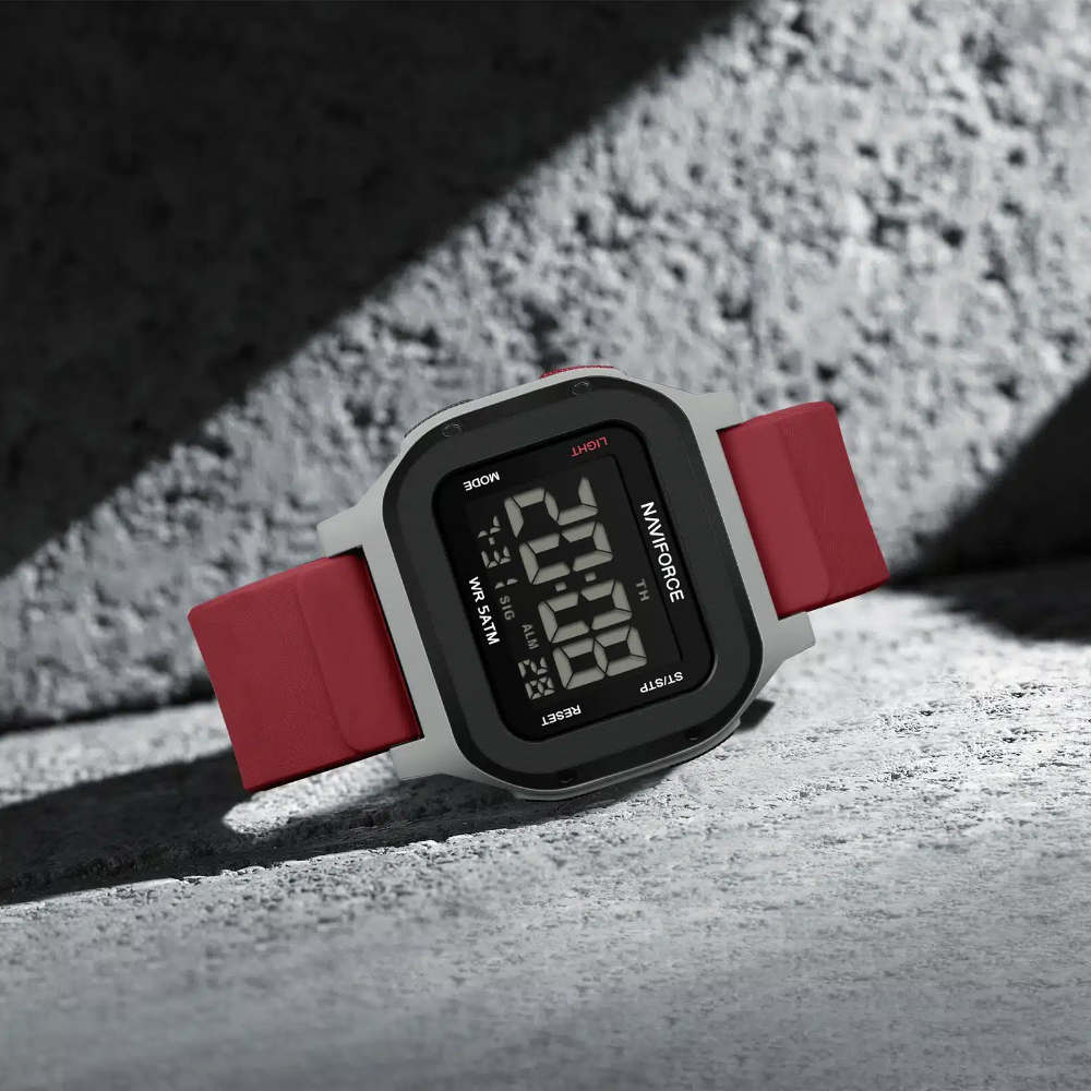 The Naviforce Aura Digital Red Fumed Silica Strap Men's Watch NF7137 S/R combines bold styling with practical functionality. Featuring a striking 48mm black ABS plastic case paired with a vibrant red fumed silica strap, this digital timepiece delivers a modern aesthetic. The HD acrylic crystal protects a display with date and day functions, while reliable quartz movement keeps accurate time. Water-resistant to 5 ATM, it handles everyday moisture exposure. At just 63g, it's lightweight and comfortable for all-day wear. Backed by a 1-year local and international warranty, this watch offers dependable performance for the contemporary man.