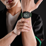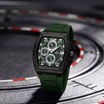 The Naviforce NF8050 combines bold styling with practical functionality. This barrel-shaped men's watch features a striking black zinc alloy case paired with a comfortable green fumed silica strap. The 42mm case houses a hardened mineral glass face protecting a quartz movement with three hands, date display, and chronograph function. Water-resistant to 3 ATM, it's suitable for daily wear and splash protection. Weighing just 96g with a 13mm profile, it delivers a balanced aesthetic. Backed by a 1-year local and international warranty, this timepiece offers reliable performance for the modern man.