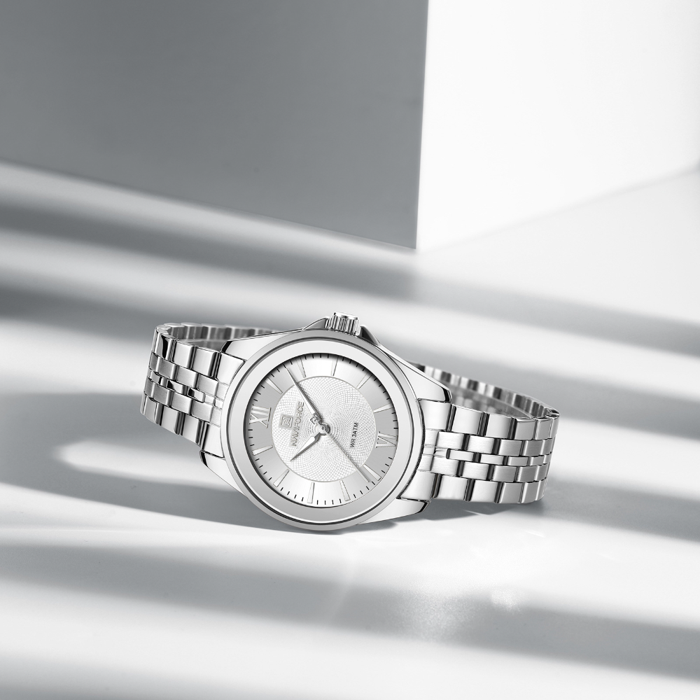 Naviforce Silver Dial Stainless Steel Strap Women's Watch | NF5067 S/W/S The NF5067 in silver presents a cohesive, minimalist design that prioritizes functionality and elegance. The uniform silver stainless steel construction across the case and strap ensures consistent durability and corrosion resistance, while the silver dial maintains a refined aesthetic without visual distraction. Naviforce's engineering expertise delivers precise timekeeping in a streamlined format suitable for any occasion. The high-quality stainless steel resists wear and maintains its polished appearance through extended use. This timepiece appeals to those who value understated sophistication, offering a versatile companion that seamlessly transitions between professional environments and everyday activities.