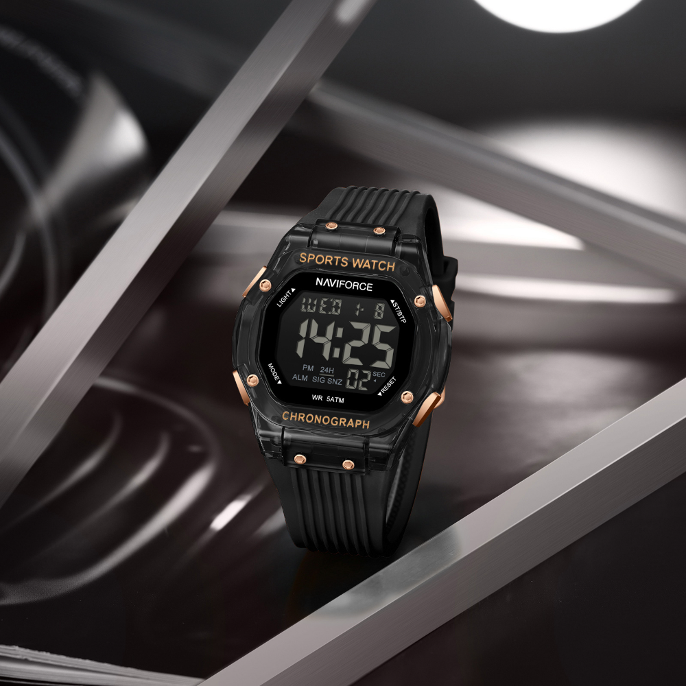 The Naviforce Digital Storm NF7113 combines bold styling with practical functionality. This men's watch features a striking 44mm black polycarbonate case paired with a comfortable fumed silica strap. The HD acrylic crystal protects a digital display with date and day functions, powered by reliable quartz movement. At just 51g, it's lightweight for all-day wear. With 5 ATM water resistance, it handles daily splashes and light water activities. Backed by a 1-year local and international warranty, this timepiece delivers modern design and dependable performance for the contemporary man.