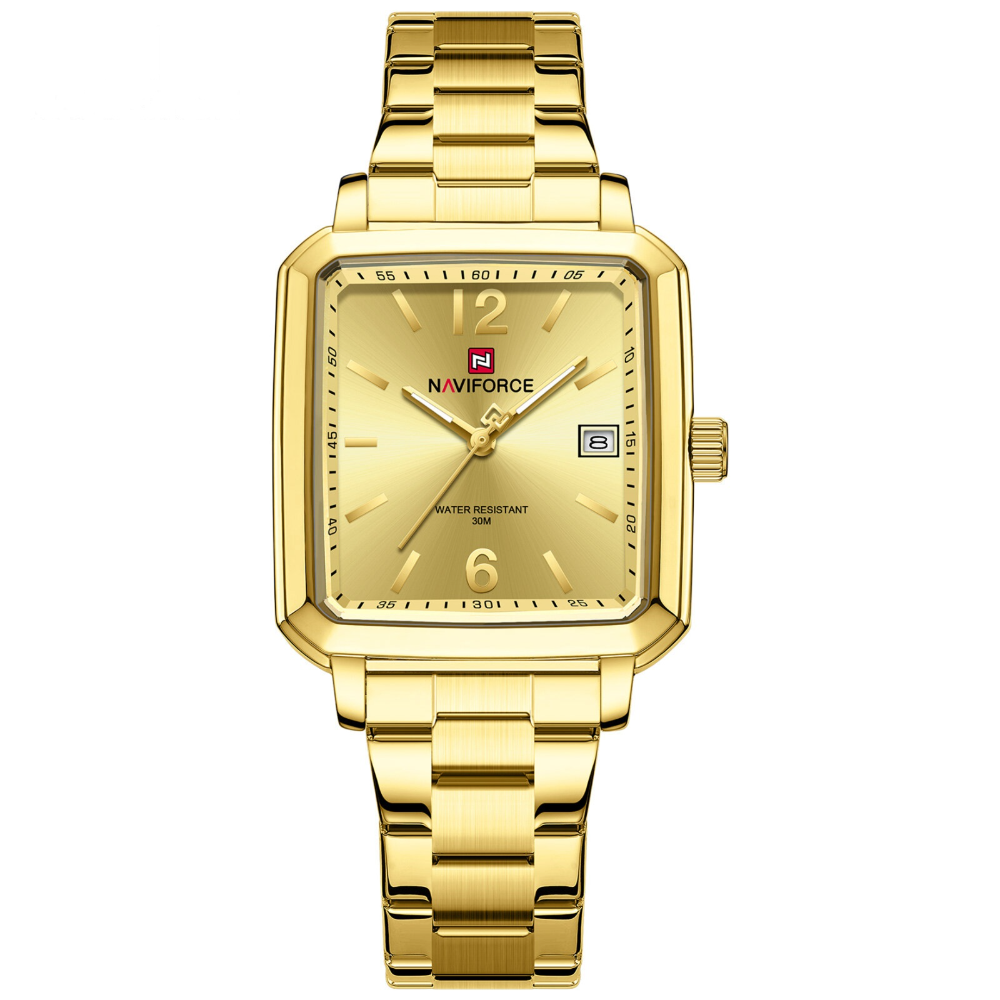 Naviforce Gold Dial Stainless Steel Strap Men's Watch NF9252G G/G/G radiates warmth and elegance with its luxurious all-gold design. The champagne gold dial harmonizes perfectly with the gold-toned stainless steel case and matching strap, creating a cohesive, radiant aesthetic. Ideal for those seeking refined sophistication, this timepiece features dependable quartz movement and water resistance for daily confidence. The polished finish catches light beautifully, while the premium stainless steel construction ensures lasting durability and timeless appeal.
