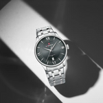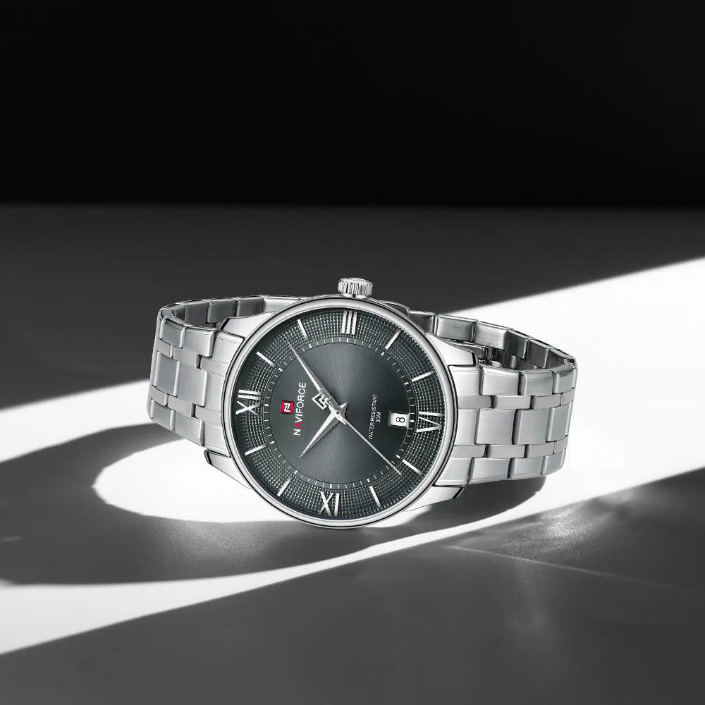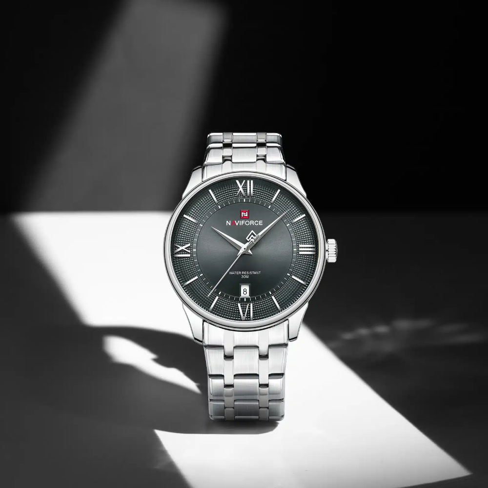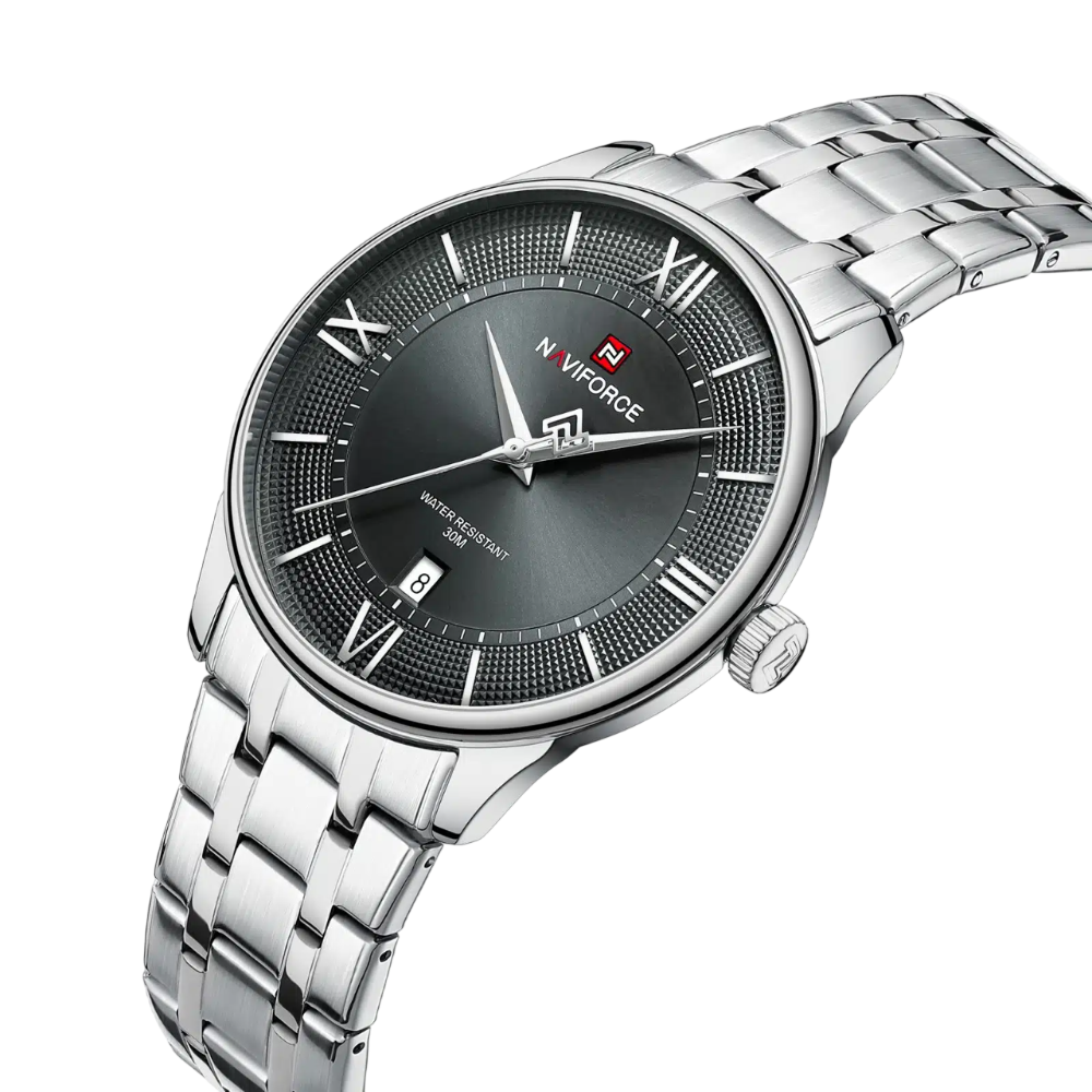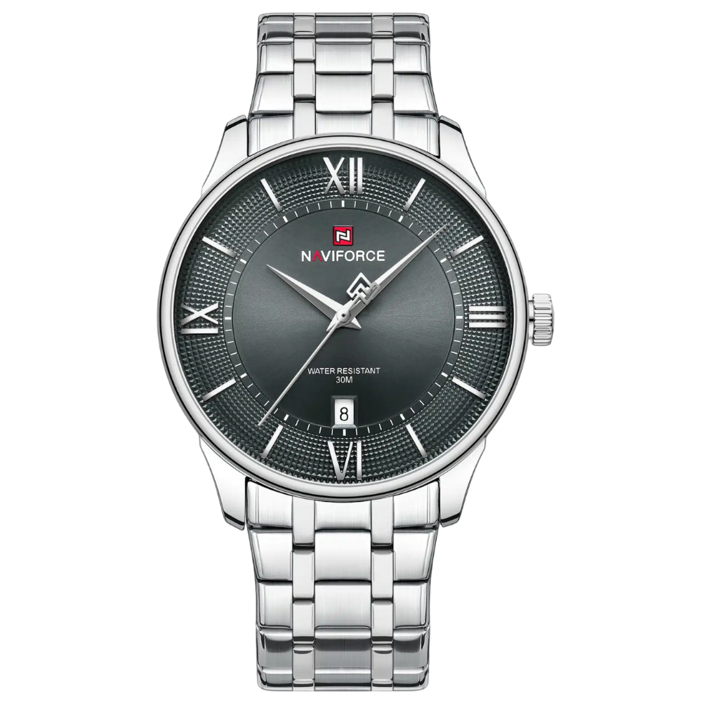 Naviforce Gray Dial Stainless Steel Strap Men's Watch NF9272S S/GY/S epitomizes understated elegance with its sophisticated gray dial and polished stainless steel case. The matching silver-tone strap creates a seamless, refined aesthetic perfect for professional and casual settings. Engineered for everyday reliability, this watch features accurate quartz movement and water resistance for daily confidence. The neutral gray dial offers excellent visibility, while the robust stainless steel construction ensures lasting durability and timeless sophistication.