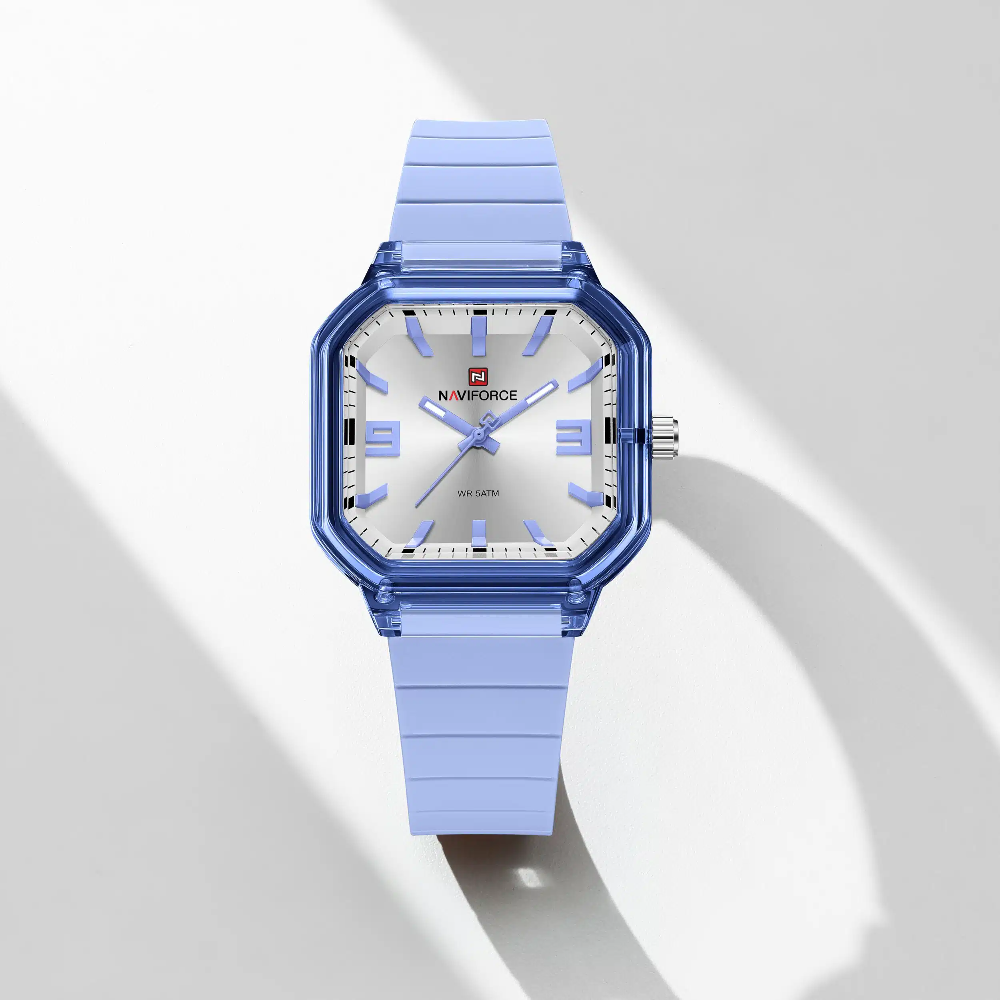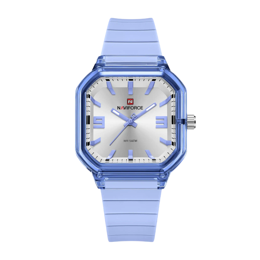 Introducing the Naviforce Modern Muse, a striking women's watch that combines contemporary style with reliable performance. Featuring a vibrant blue polycarbonate case paired with a comfortable fumed silica strap, this 38mm timepiece delivers both elegance and durability. The HD acrylic crystal protects a clean 3-hand quartz movement, while 5 ATM water resistance makes it suitable for daily wear and water activities. At just 37g, it's lightweight and comfortable for all-day wear. Backed by a 1-year local and international warranty, the Modern Muse is the perfect accessory for the modern woman.