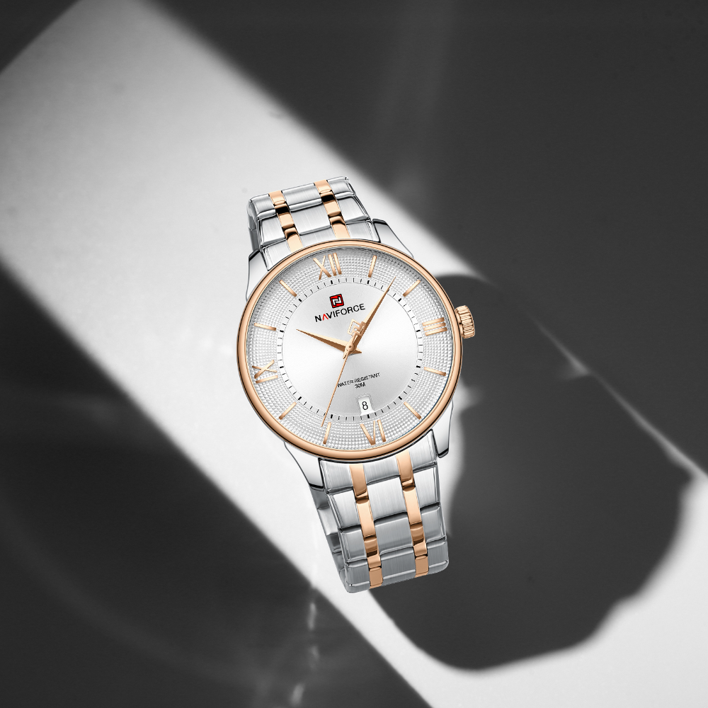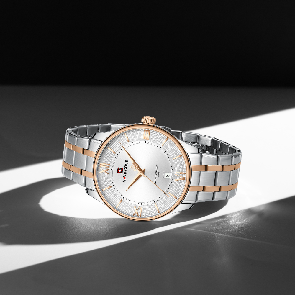 Naviforce Silver Dial Stainless Steel Strap Men's Watch NF9272S S/W/RG combines classic elegance with contemporary flair. The pristine silver dial pairs beautifully with the polished silver stainless steel case and rose gold-toned strap for a sophisticated two-tone aesthetic. Perfect for the modern gentleman, this timepiece features dependable quartz movement and water resistance for versatile daily wear. The refined color contrast adds visual interest, while premium stainless steel construction ensures lasting quality and refined style.