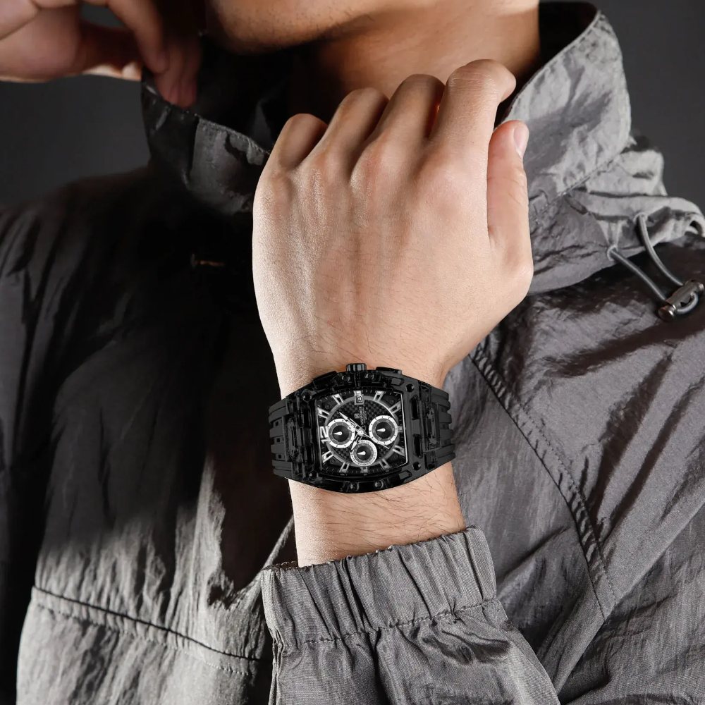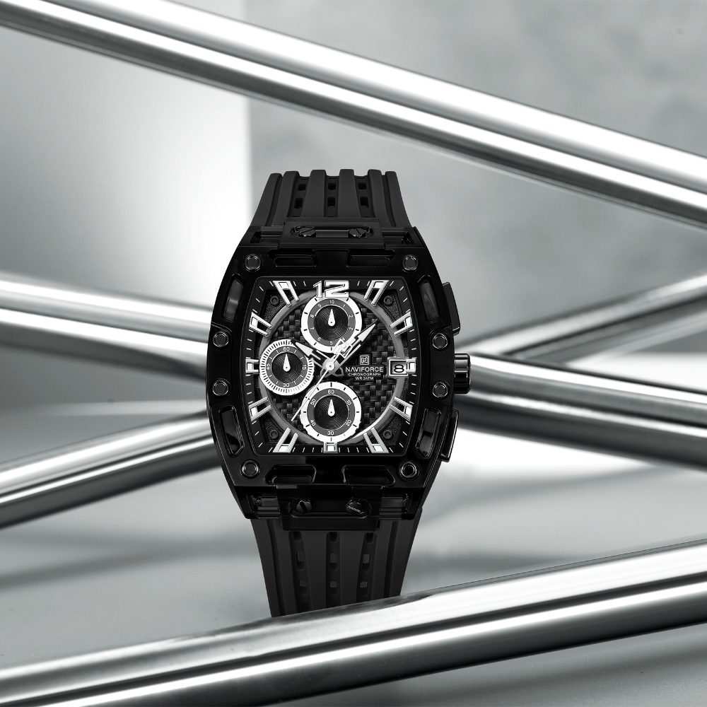 The unique Naviforce NF7105 Watch boasts a jelly-like transparent case that exudes a futuristic design, complemented by irregular fork-shaped indexes that reflect masculine strength and confidence. The intricately woven and spiral texture on the dial add visual depth and appeal. At the same time, the stunning silicone strap ensures optimal comfort even with extended wear. Also with the eco-friendly luminescent coating, the watch remains visible in low-light conditions and recharges with light exposure. The precise multifunctional small dial includes 1/10 second, chronograph minute, and second chronograph features, along with a 3-point date display for comprehensive time management. Weighing only 54G, it is lightweight and effortless to wear in any situation. The Naviforce NF7105 is more than just a watch, it combines style and function seamlessly.