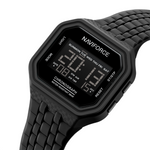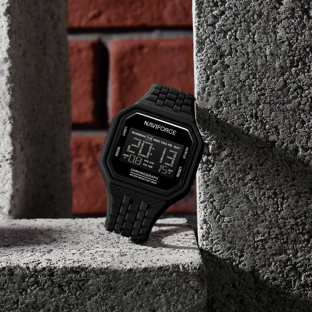 Experience modern sporty elegance with the Naviforce NF7116 B/B. This striking black timepiece features a robust 42mm ABS plastic case with HD acrylic crystal protection, paired with a flexible TPU strap designed for comfort during intense activities. Powered by reliable quartz movement, it displays time digitally with convenient date and day indicators. Built tough with 5 ATM water resistance for swimming and snorkeling, yet refined enough for everyday wear. At just 52g, this lightweight watch won't weigh you down. Enjoy peace of mind with comprehensive 1-year local and international warranty coverage on your new sports companion.