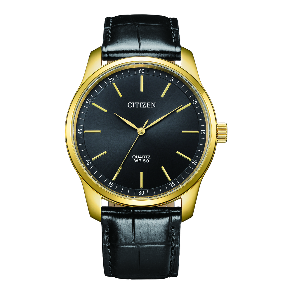 The Citizen BH5002-02E is a sleek and sophisticated timepiece that blends timeless elegance with modern reliability. Featuring a black dial, gold-tone stainless steel case, and a premium black leather strap, this watch exudes class and versatility—perfect for both formal and casual wear.