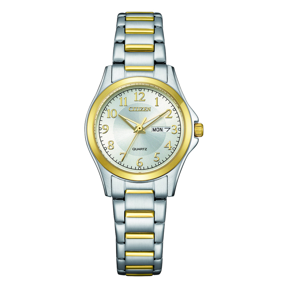The Citizen EQ0614-52B is a sophisticated and versatile timepiece, designed for women who love timeless elegance with a modern touch. Its 27.5mm stainless steel case features a beautiful two-tone gold and silver finish, creating a luxurious yet subtle look that complements any outfit, from casual to formal.