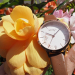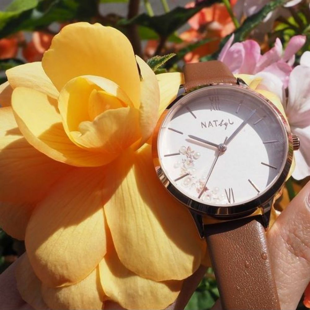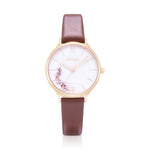 The dial features tiny pearls on the dainty Stephanotis flower bouquet design, paired with a brown genuine leather strap and a rose gold-plated case.
