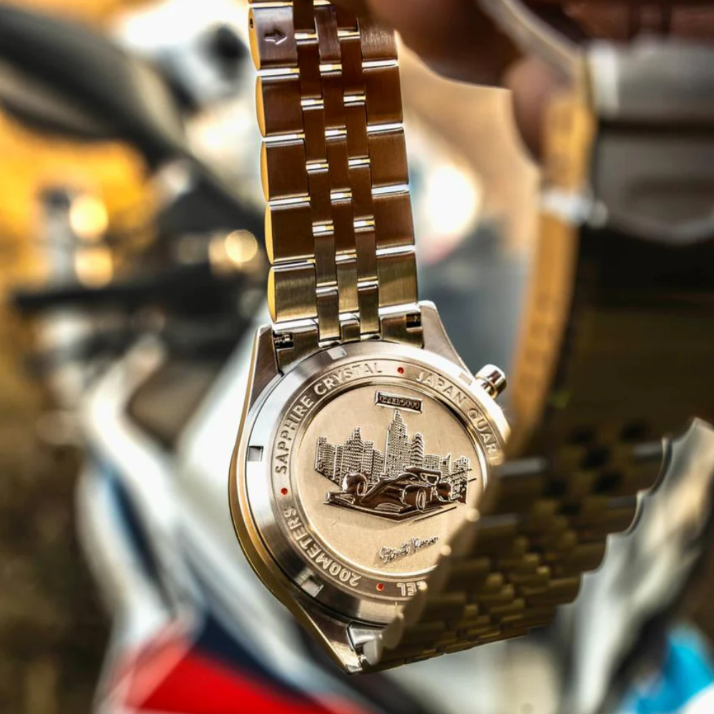 As blue as the endless Arabian skies, Drifto captures the heart of the UAE’s desert drifting culture. Blending traditional hajwalah with modern automotive flair, this watch embodies the cool precision of drifting across desert sands at 200 km/h. The blue dial reflects the fusion of Bedouin bravery and cutting-edge technology, where drivers race in harmony with both their machines and the vast desert. From Dubai’s urban highways to Abu Dhabi’s dunes, Drifto celebrates controlled power, skill, and the spirit of a rapidly evolving motorsport scene that’s as bold and beautiful as the desert itself.