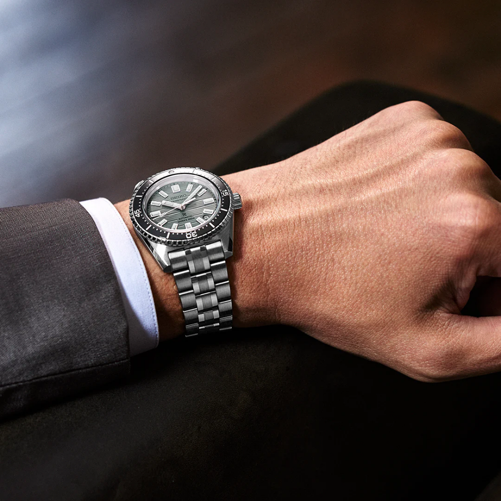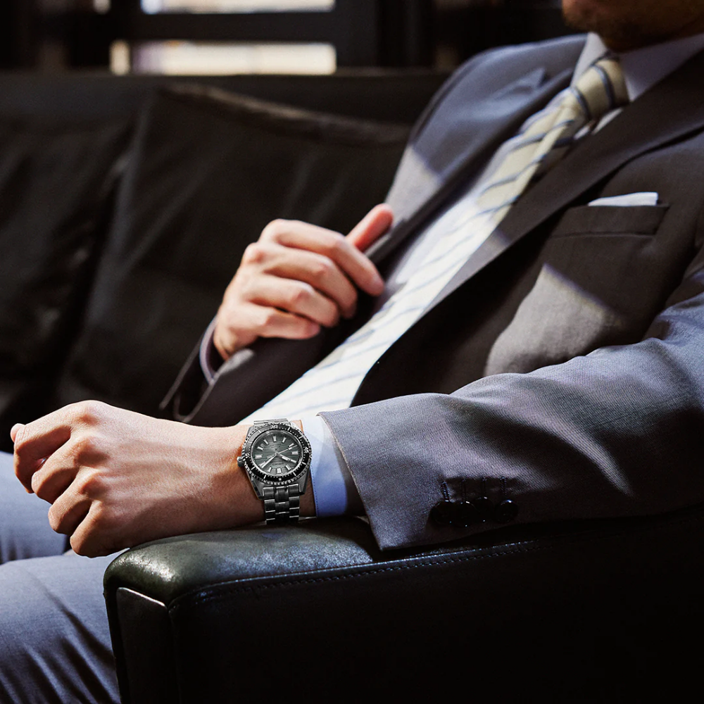 The “Marinemaster” range has been revamped in 2023, offering a chance to rediscover the iconic sporty chic design of the iconic “62MAS” from 1965. This Prospex watch is water-resistant to 20 bar and features a steel bracelet with an elegant alternation of polished and brushed finishes. It also features a textured dial and, for the first time in a Seiko professional dive watch, a transparent screw-down case back.