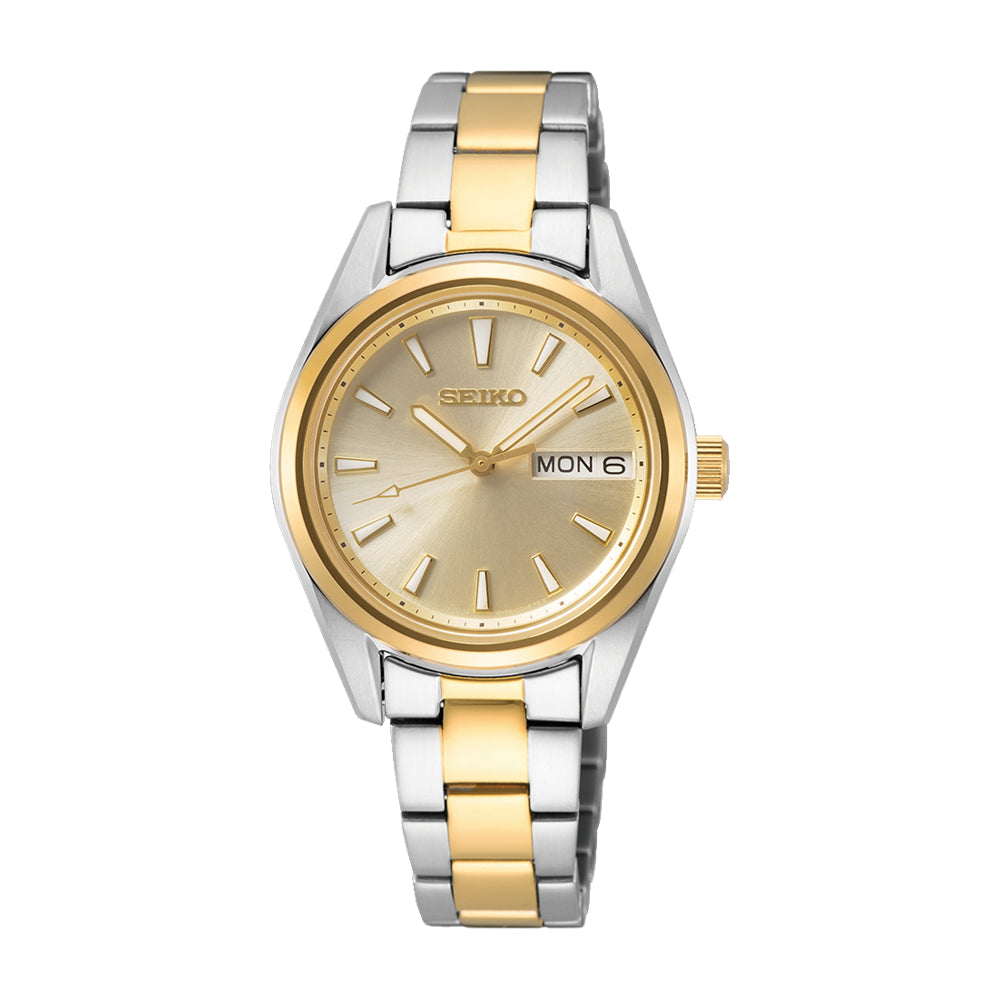 The SUR354P1P quartz watch is the perfect expression of an elegant, dressy woman's watch. Its stainless steel case and bracelet are tinged with yellow gold accents to add a little distinction without overdoing it. Its beautiful gold dial is complemented by white hands and hour markers. It will also stand the test of time thanks to its 10 bar water resistance and scratch-resistant sapphire glass crystal.