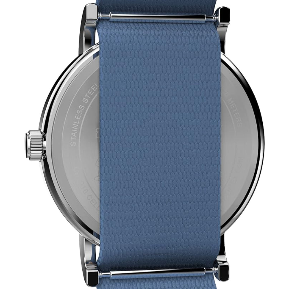 - 38mm round silver brass case complemented by a single layer blue fabric slider strap and buckle clasp