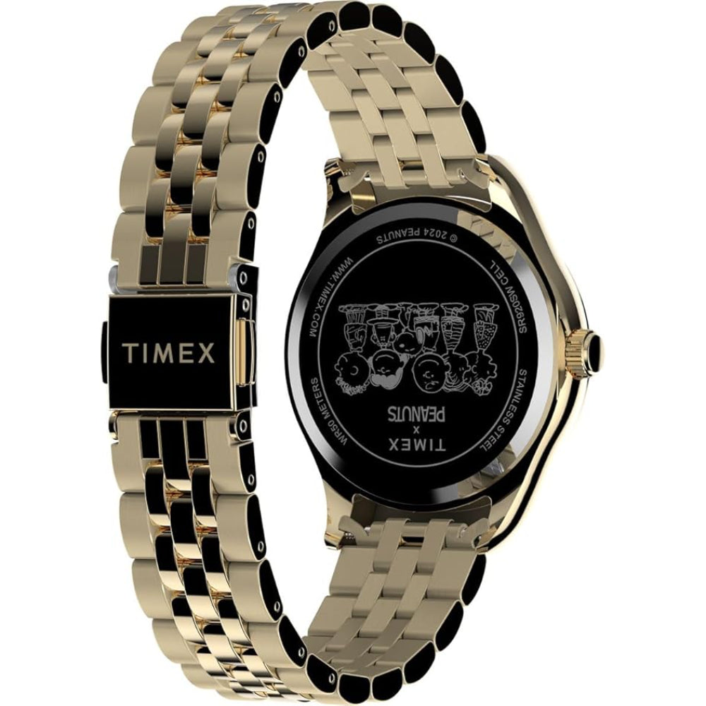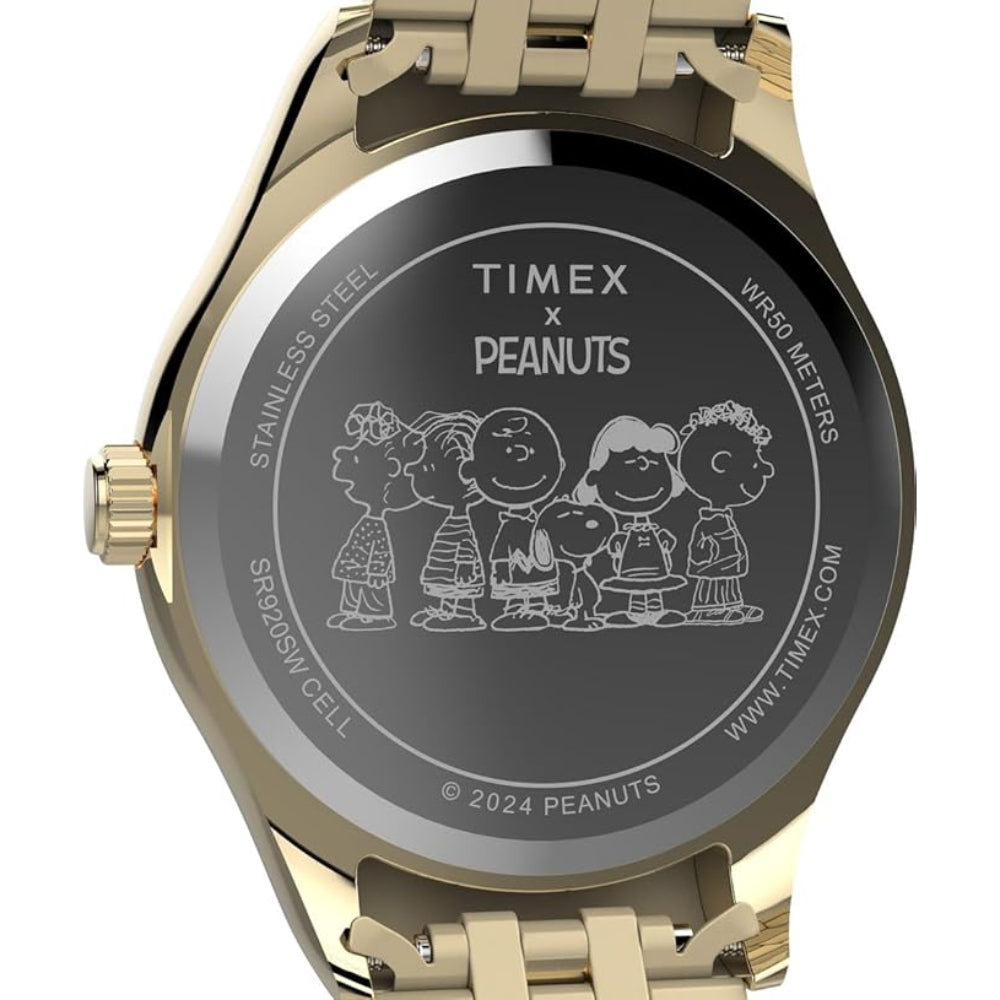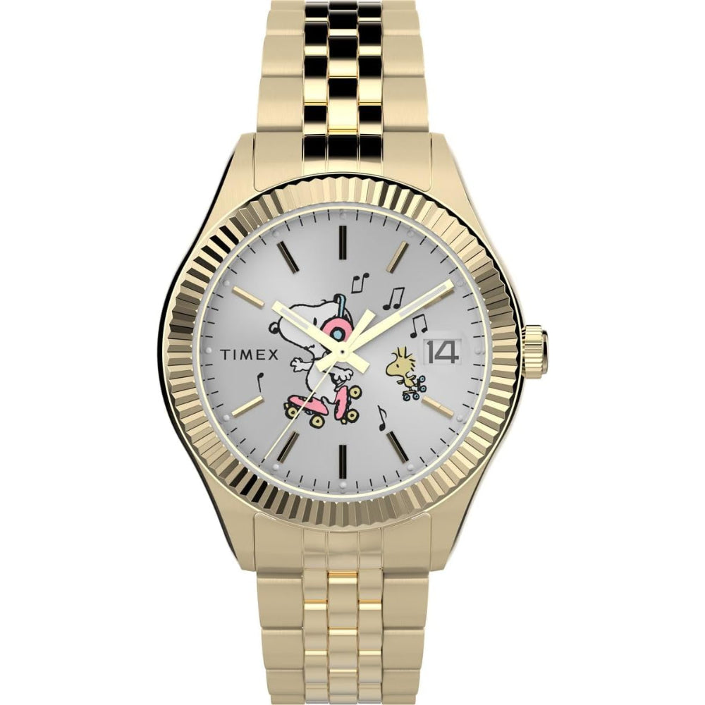 Let’s roll! Snoopy and Woodstock roller skate their way across the dial of our Timex Legacy. This playful 34mm watch is a collectors’ item just as much as it is an accessory you can wear every day, featuring a gold-tone recycled stainless-steel case and bracelet. A classic construction celebrates our roots with ageless style, complemented by an elegantly fluted bezel, date display, Luminant hands, and brushed silver sunray dial.