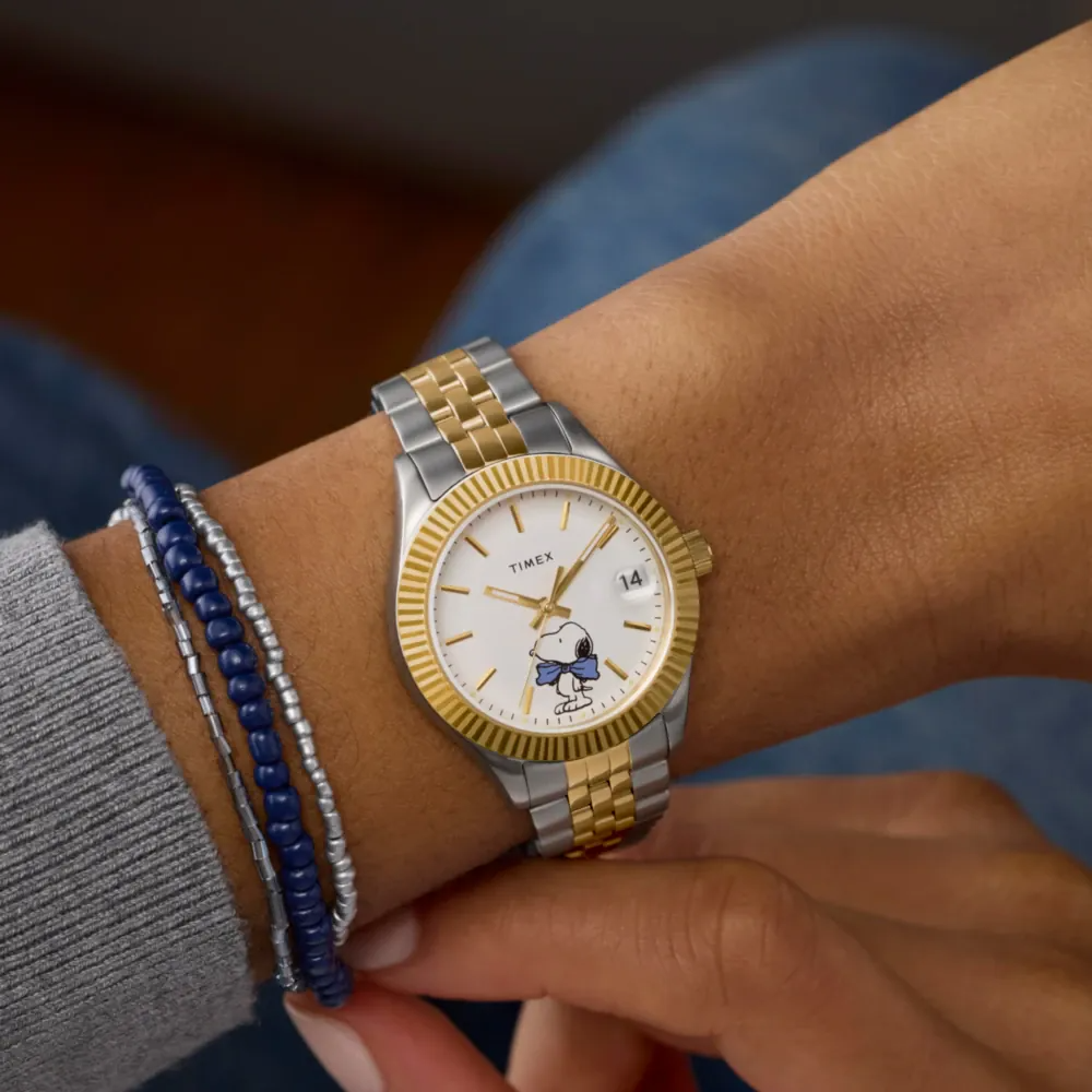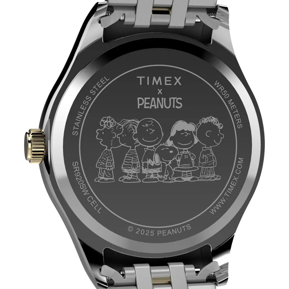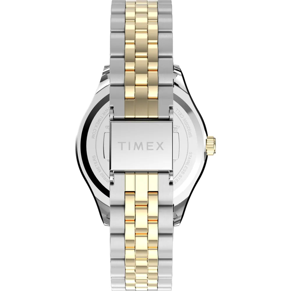 This Timex watch has a case made of stainless steel with a diameter of 34 mm and is fitted with a stainless steel band. Inside the case lies a Timex movement and the watch features a Mineral crystal.