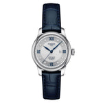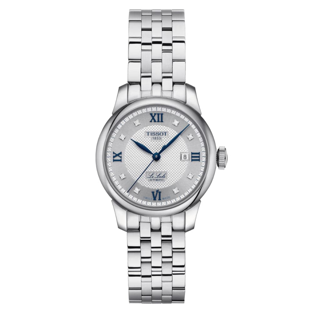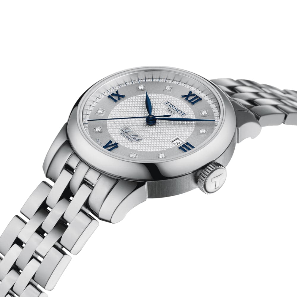 Protected by a scratch-resistant sapphire crystal, the silvered dial displays blue Roman numerals at 12, 3, 6 and 9 o'clock, the date and eight diamonds forming the hour markers.The Tissot Le Locle Automatic Lady (29.00) 20th Anniversary comes with two bracelets that can be switched up easily and without tools thanks to a quick-change system: a 316L stainless steel bracelet and a dark blue leather strap.