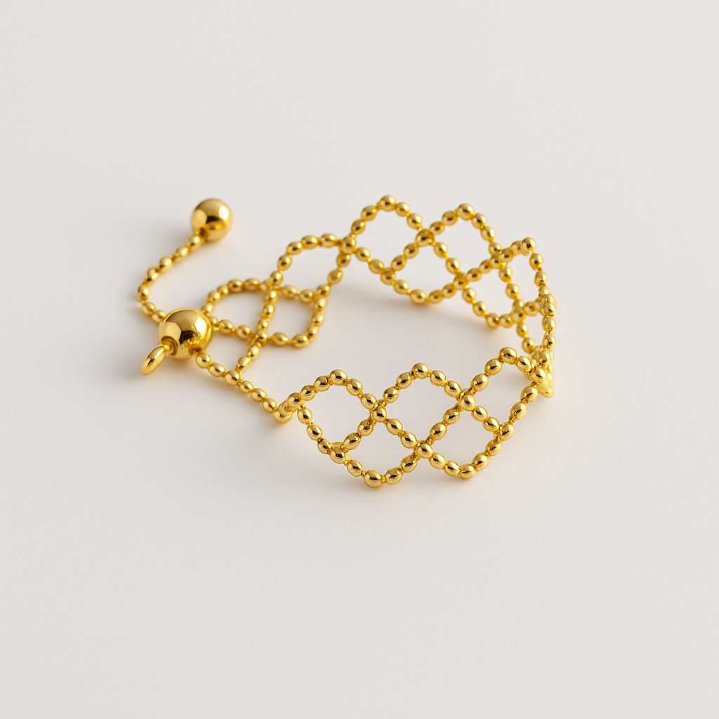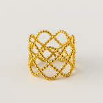 The Golden Lattice Ring is a celebration of modern artistry and timeless sophistication. Crafted with an intricate openwork lattice design, it exudes both delicacy and strength, making it a truly versatile piece. The golden beaded framework wraps elegantly around the finger, creating a look that is both bold and refined. Perfect for those who appreciate understated luxury, this ring transitions seamlessly from everyday wear to evening elegance. A symbol of harmony and refinement, it is designed to capture attention while maintaining effortless grace.