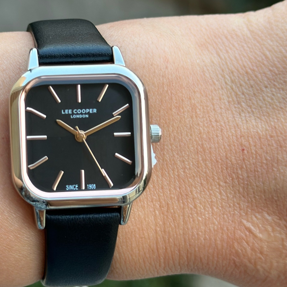 The Lee Cooper LC08152.351 women's watch is a perfect blend of functionality and fashionable design. The watch's unconventional look is achieved, among other things, by its black dial. The watch displays the time in an analog format, making reading intuitive. The silver-toned case is 26 mm wide.