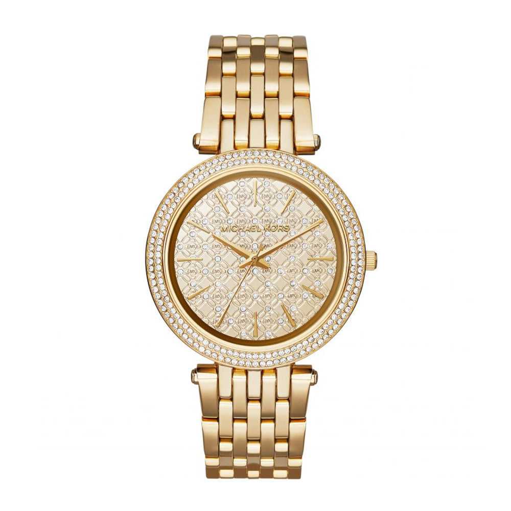 Michael Kors Darci MK3398 is an amazing and attractive WOMEN'S watch . Case material is PVD Gold plated, which stands for a high quality of the item while the dial colour is Gold. In regards to the water resistance, the watch has got a resistancy up to 50 metres. It means it can be submerged in water for periods, so can be used for swimming and fishing. It is not reccomended for high impact water sports.
