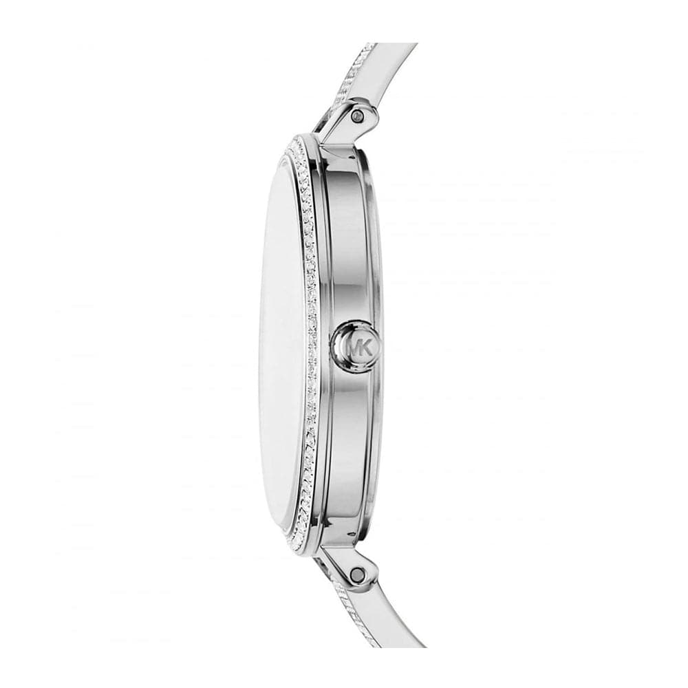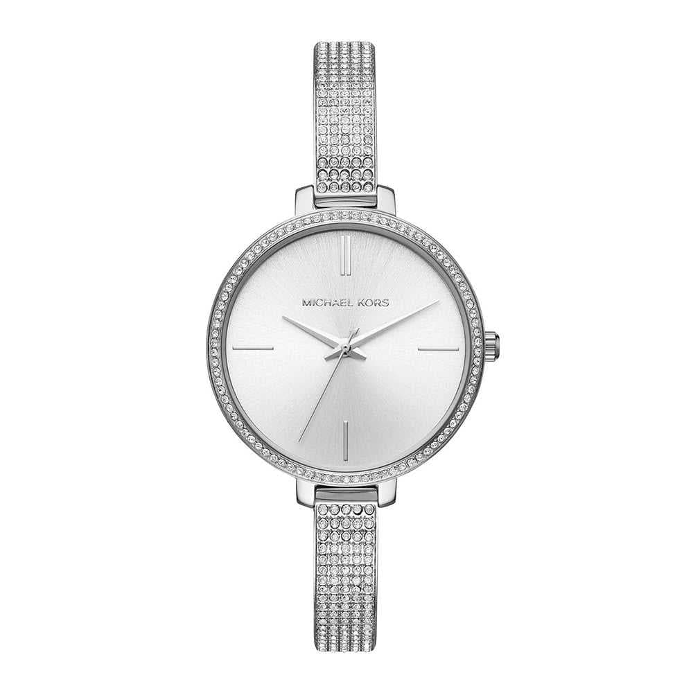 This Michael Kors Jaryn watch features a minimalist silver sunray dial, a pavé-embellished case and allover pavé half-bangle bracelet.