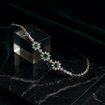 The Emerald Blossom Bracelet from AG Collective Jewelry captures the grace of nature in full bloom. Featuring a series of dazzling floral clusters, each bloom sparkles with brilliant white stones encircling a vibrant green centerpiece — reminiscent of spring flowers kissed by morning dew.