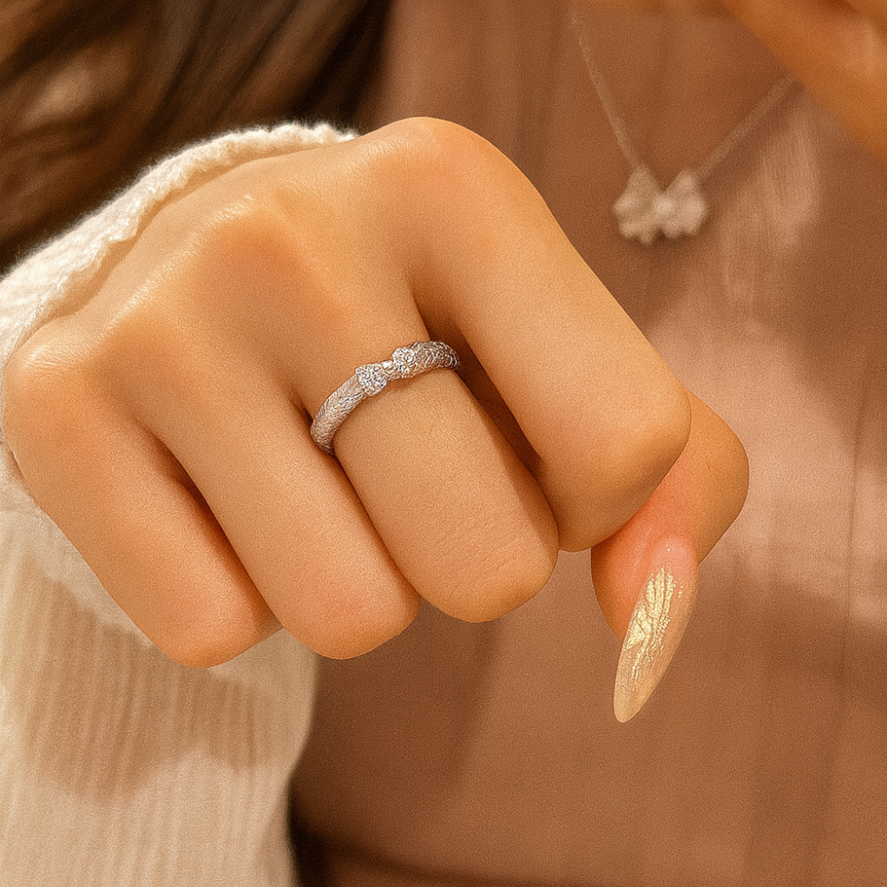 Each knot is accented with finely set stones, catching light with a subtle sparkle rather than an overpowering shine. This refined brilliance gives the ring its charm: elegant enough for daily wear, yet meaningful enough to mark life’s most intimate moments.