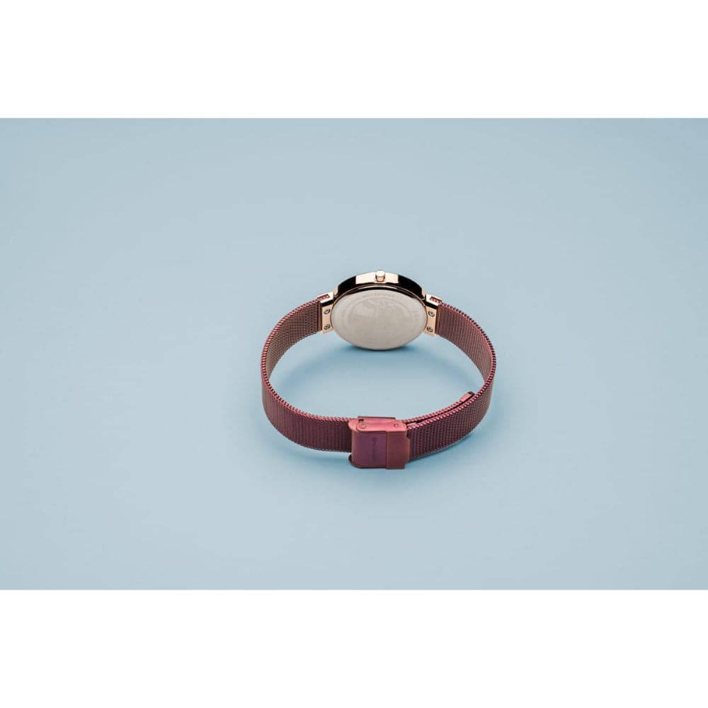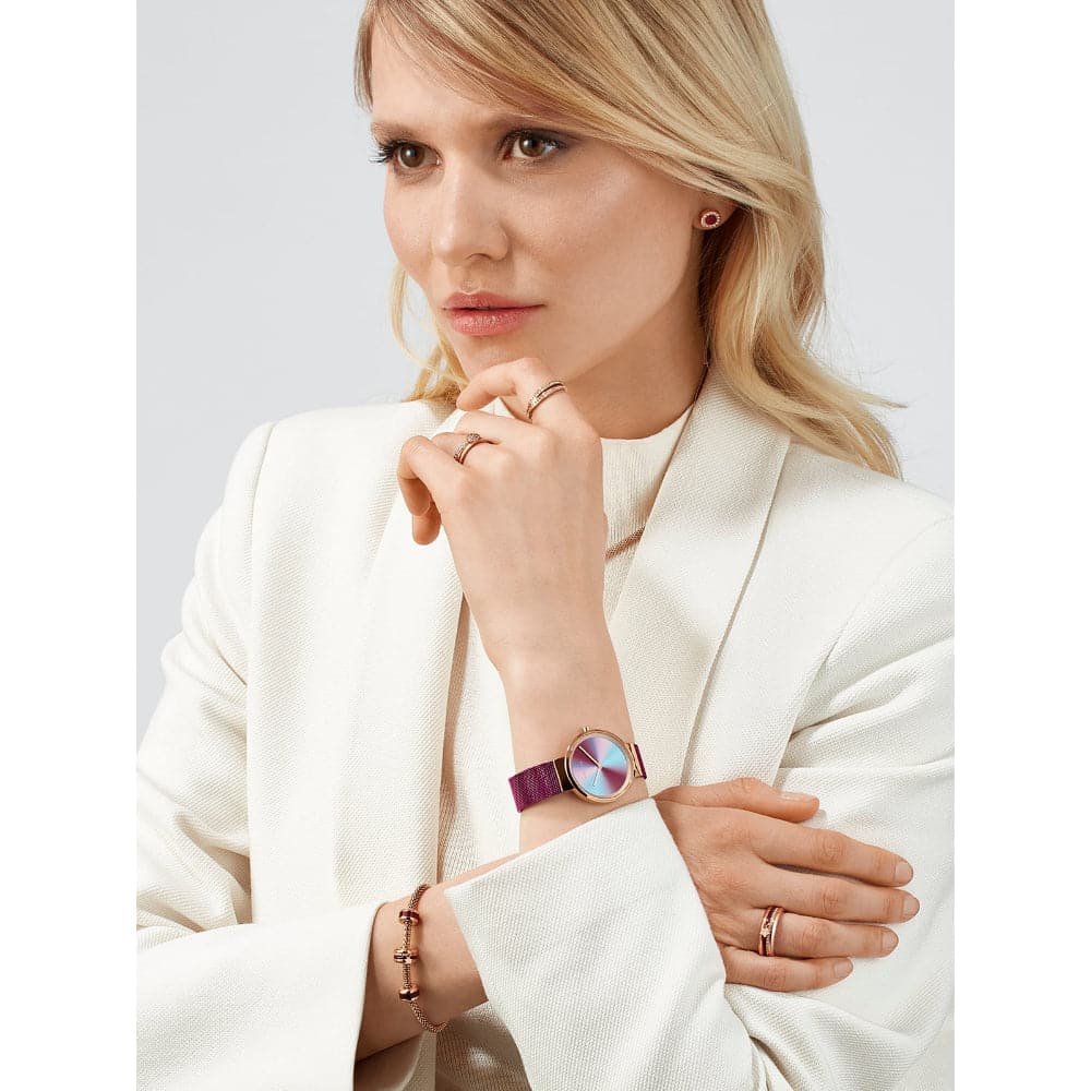 The metallic-purple coloured sunray dial lets our top-selling watch model shine in a unique way.