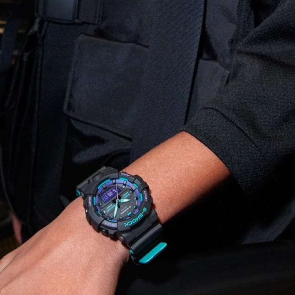 The basic black coloring of this model is updated with neon-like purple highlights on the bezel and face for a low-tech look.